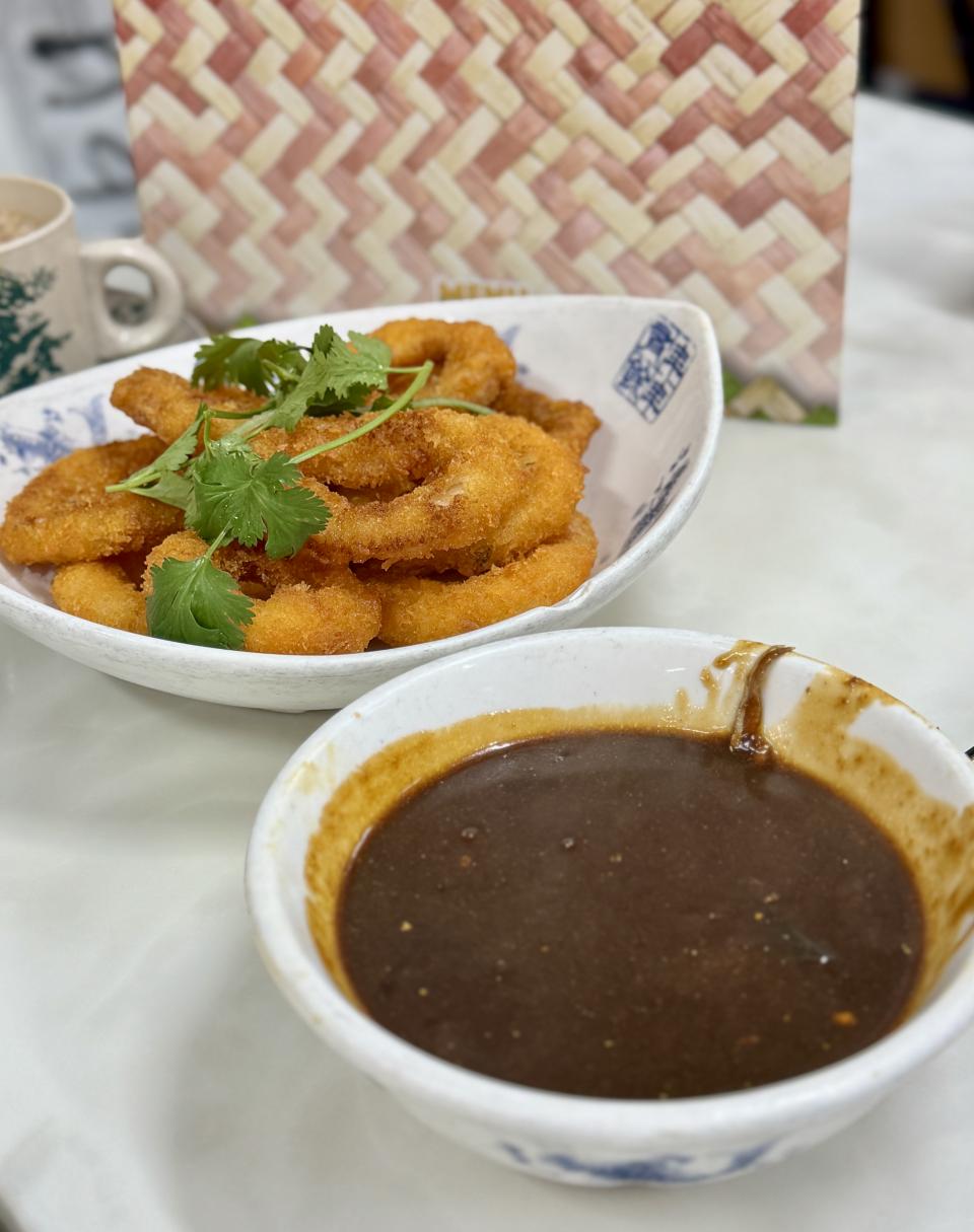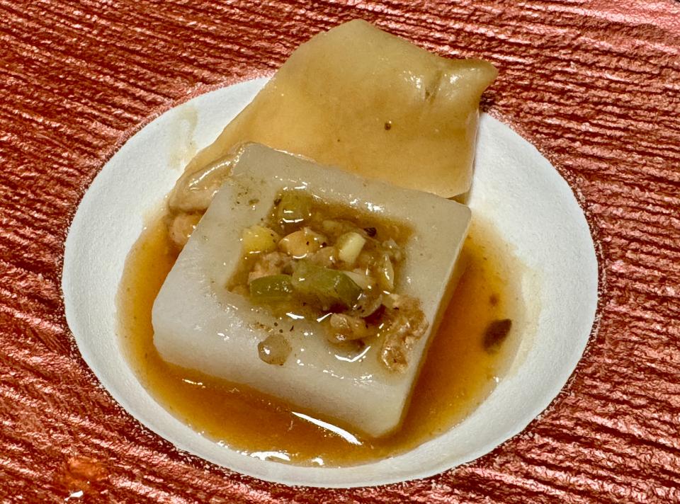 書中描述秦可卿特別鍾愛棗泥山藥糕,紅棗混合山藥先蒸後打成蓉,再加入玫瑰乾花、糯米粉、砂糖、鮮奶製作成外皮,中間包裹上棗蓉成棗泥山藥糕;食落帶有陣陣花香,外皮軟糯煙韌,餡料香甜。