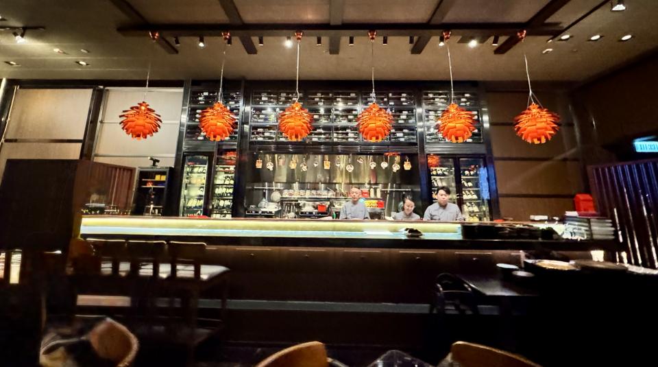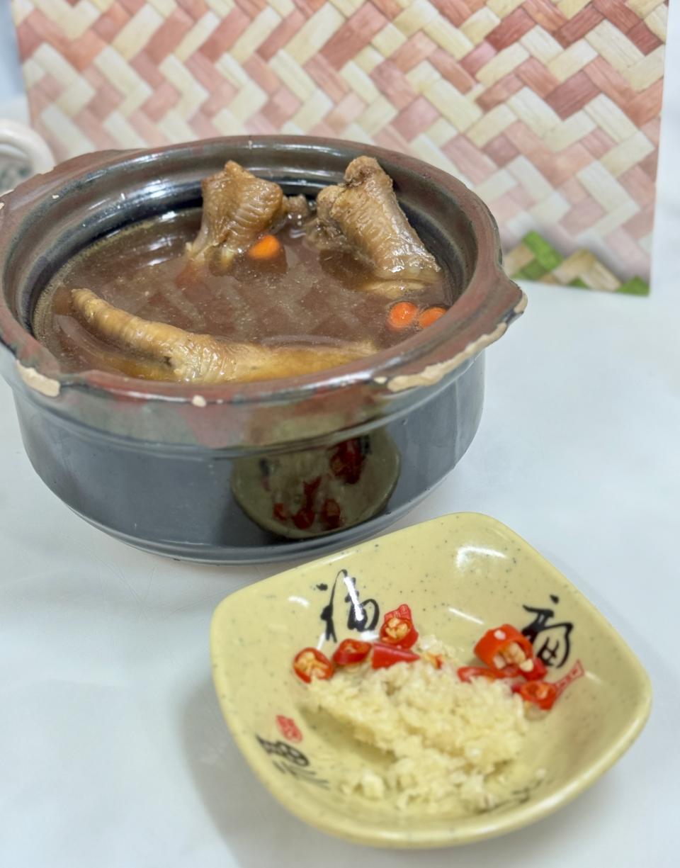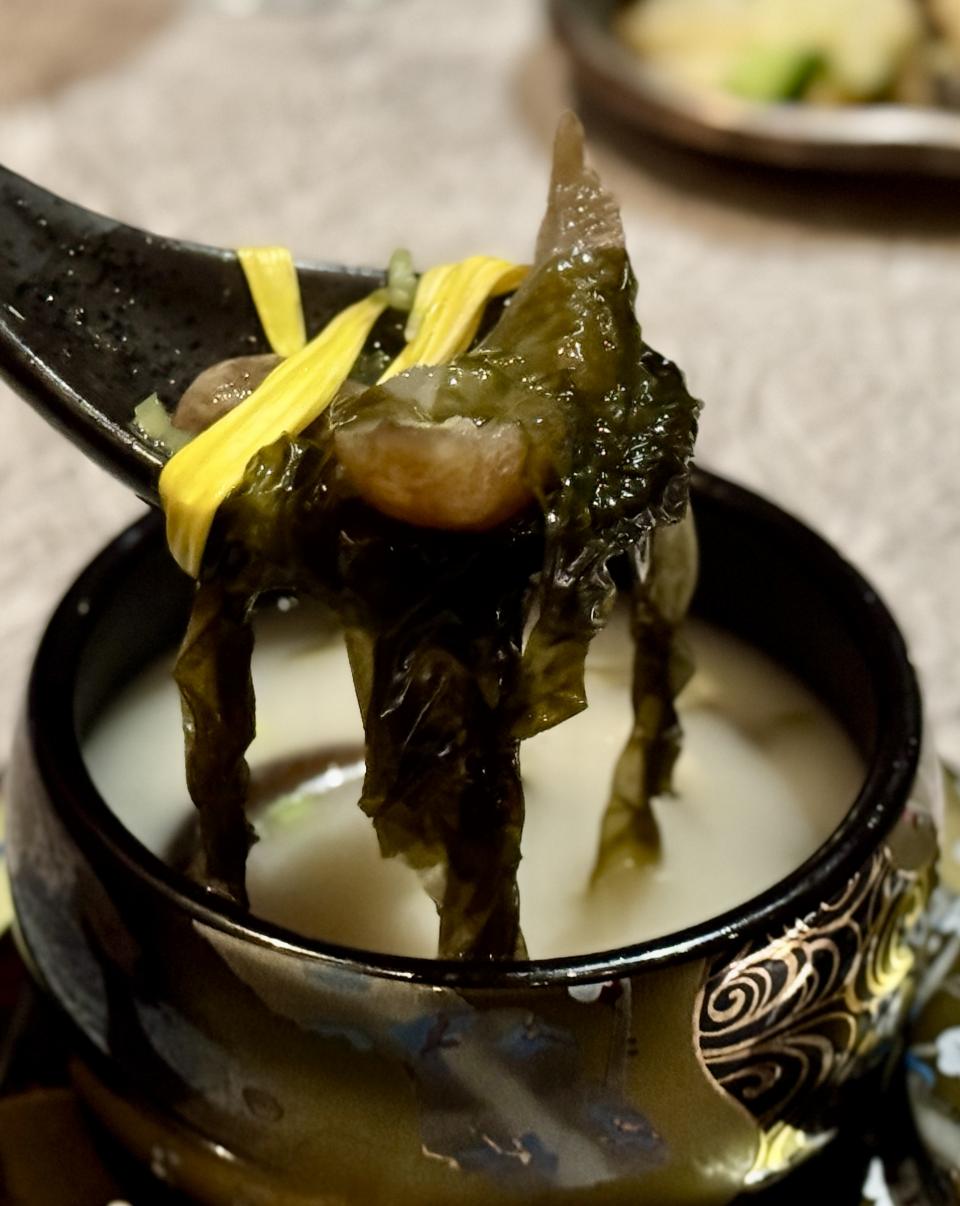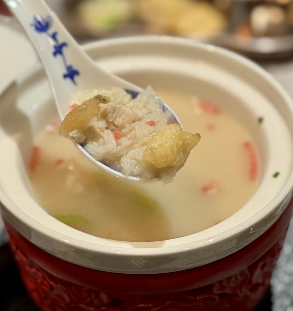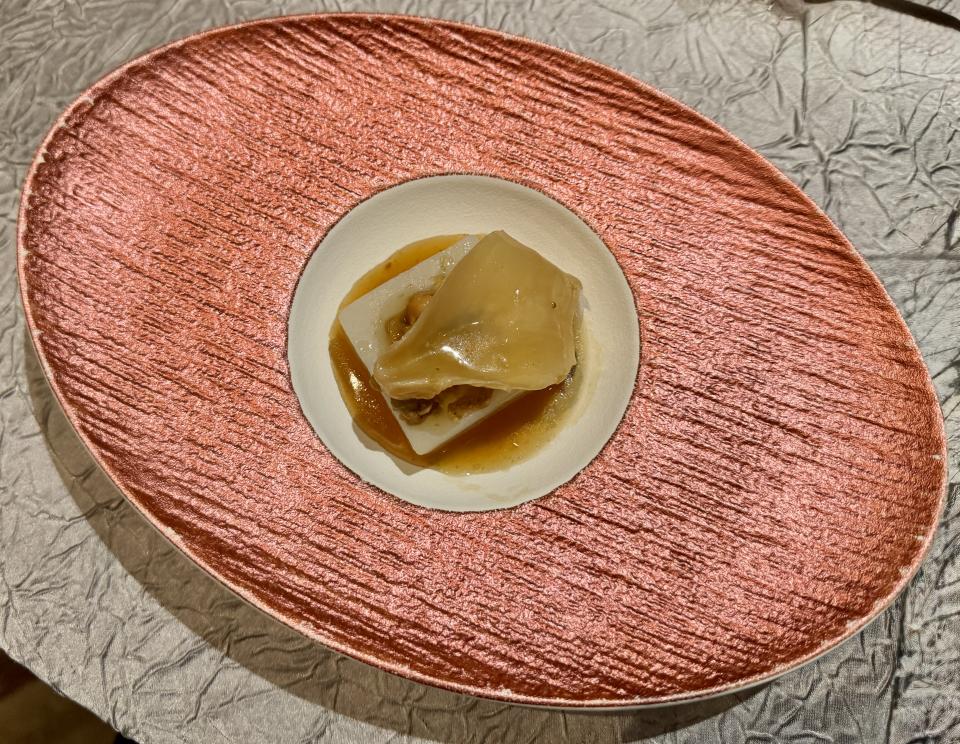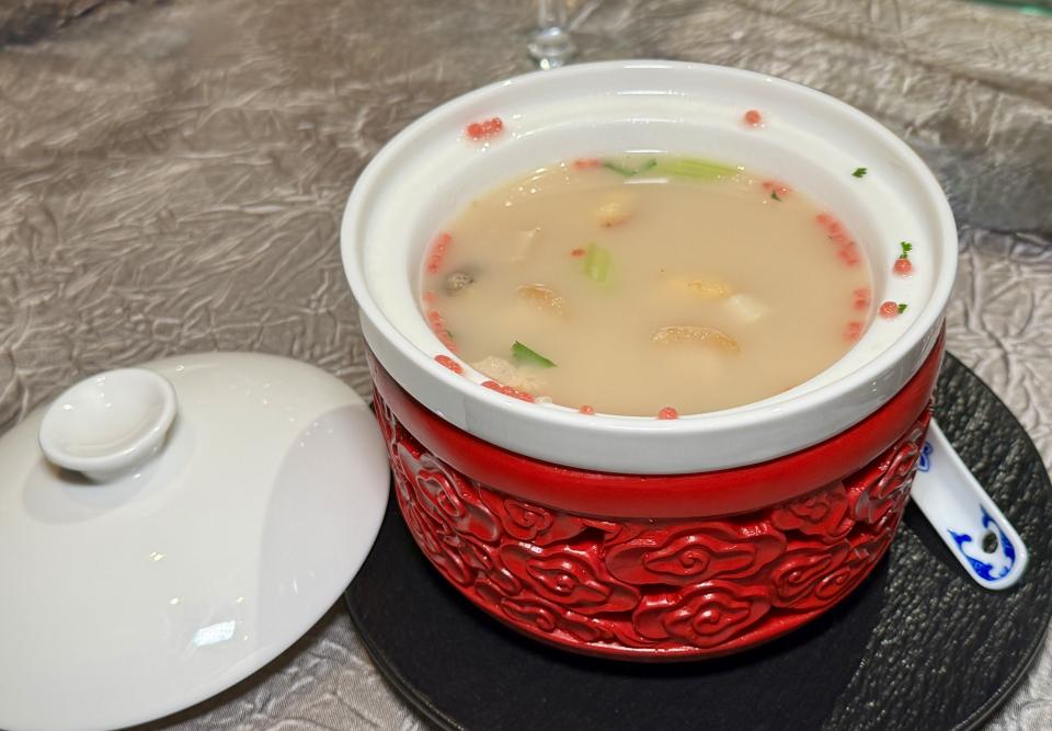 大廚以菊花點題,湯中加入豬肉、豬筒骨及老雞熬煮而成,之後放入紫菜及原條刺參再煲煮至軟腍,最後灑上適量鮮菊花奉客;湯底香濃又滋味,還滲出淡淡菊花香氣,好喝。