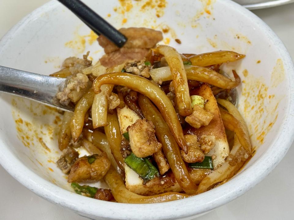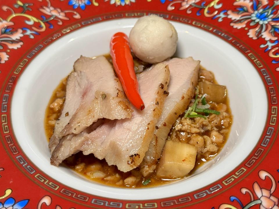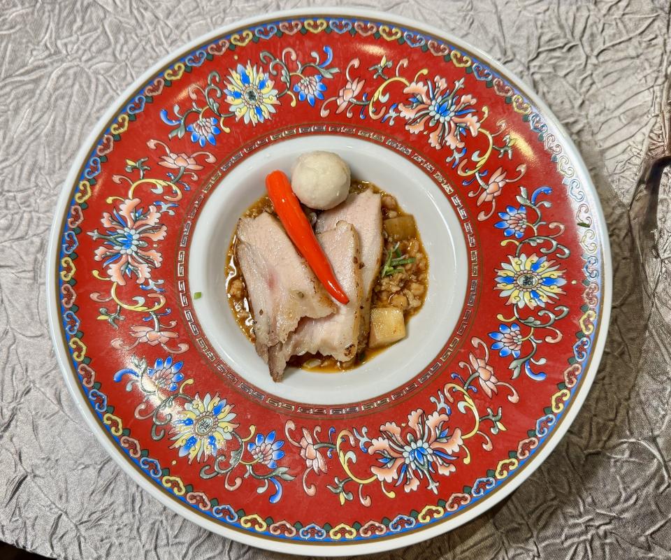 大廚以雞粒、茄子及麻辣醬,炒製出這味創意版本的「魚香茄子」;之後慢煮這精選的黑毛豬腩,肉質鮮嫩呈淡淡粉紅色,美味非常;鵪鶉蛋外層炸至微脆,食落更有質感。