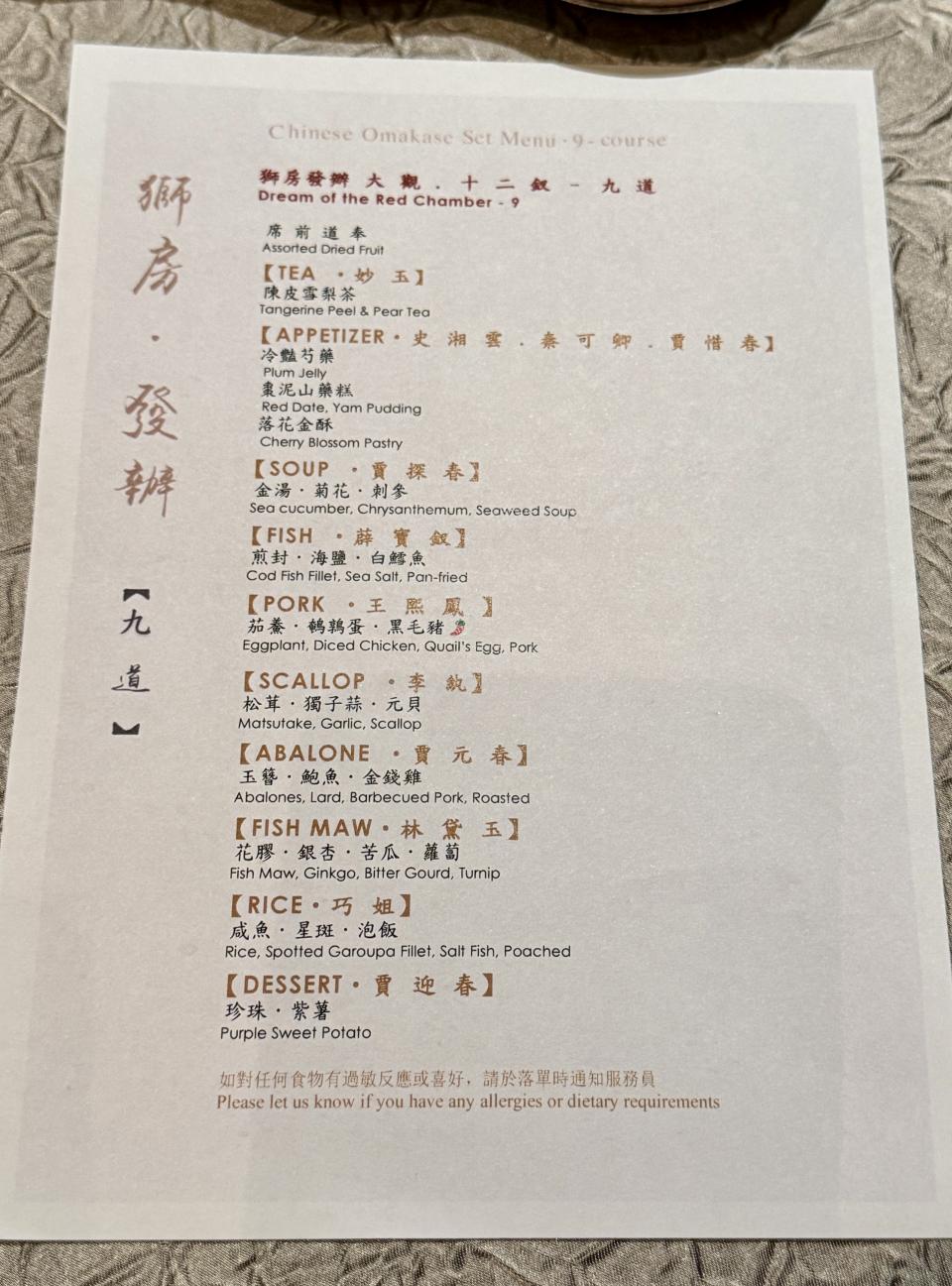 當中以「金陵十二釵」的內容及曲調為參考,加入書中對每位女性的描述及她們的個人口味,創作出這獨有的九道菜式,更可另配上這六款美酒,讓食家可一邊享用佳餚同時,另一邊又沉醉於《夢》中。