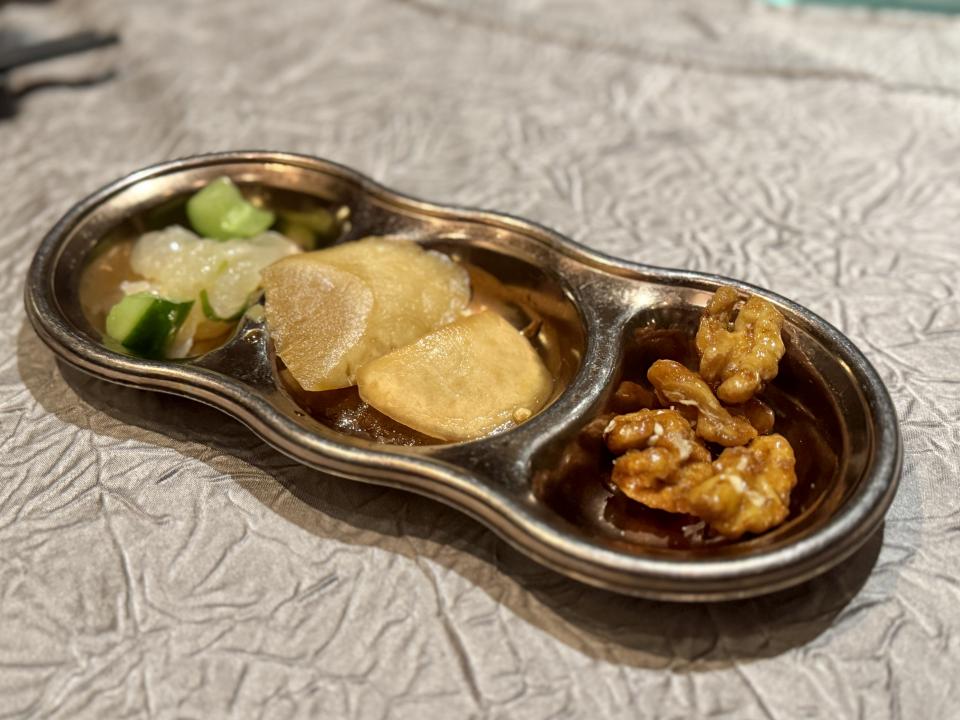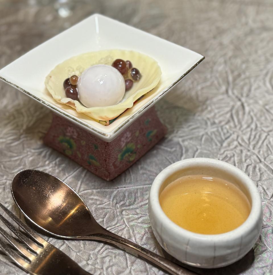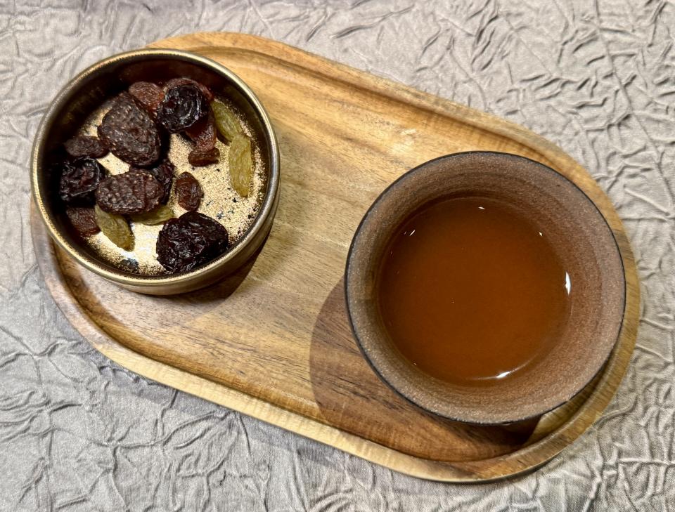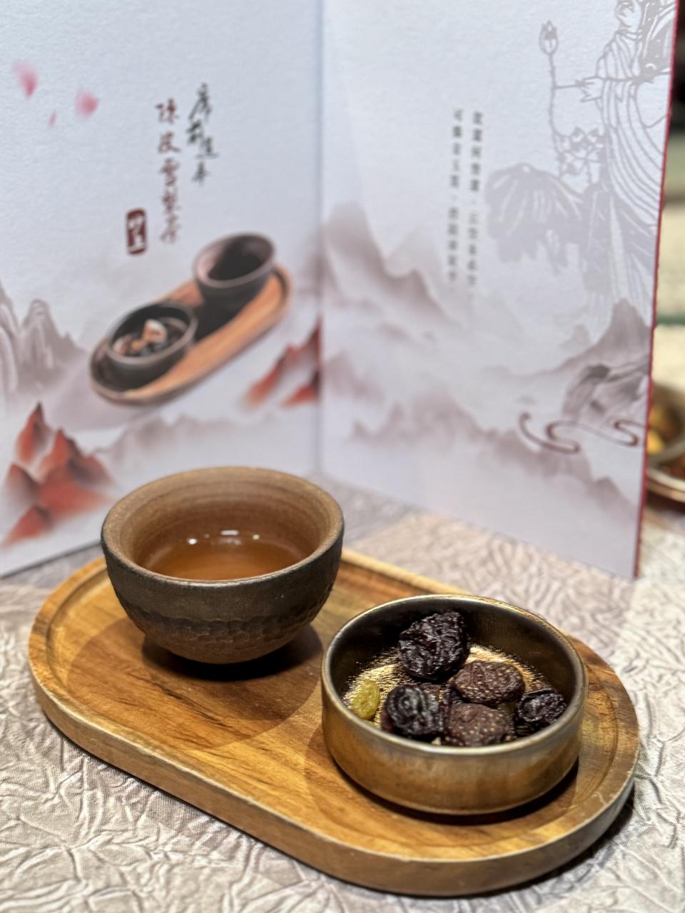 首先上場的這味「席前道奉」,旁邊放有大小不同的乾果及一杯清潤解喝的陳皮雪梨茶;書中描述妙玉非常喜歡吃乾果,而對品茗也相當有講究,這杯茶也正式為饗宴揭開序幕。