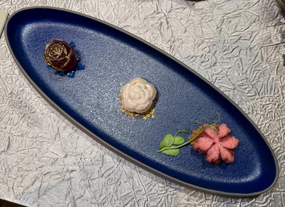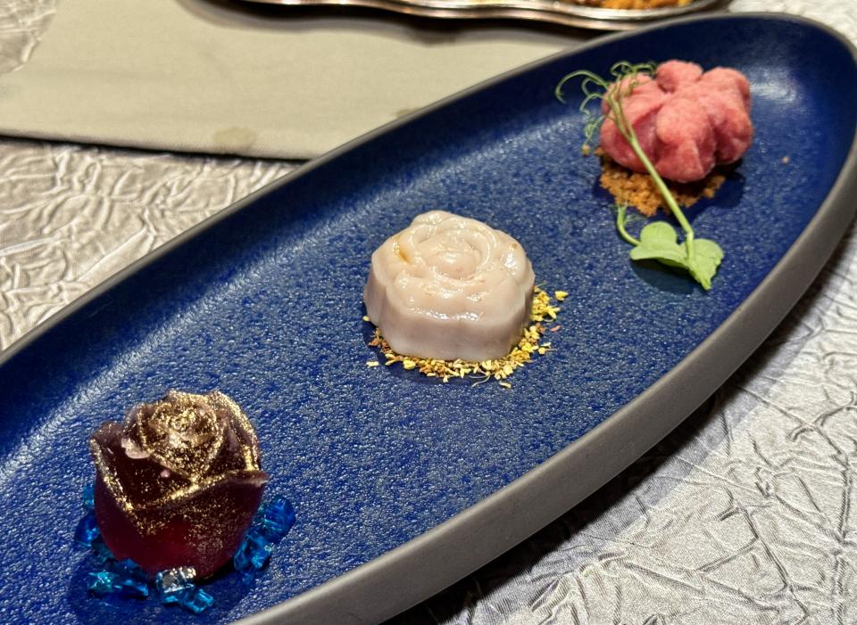 第二味頭盤以三花代表三位金釵,而三位也各自有不同的美態,包括:冷豔芍藥、棗泥山藥糕 及 落花金酥。