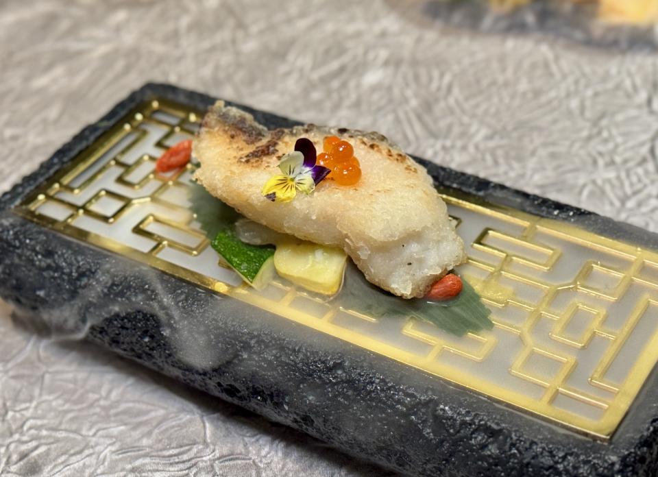 大廚以白滑、豐盛又細膩的白鱈魚,代表體態豐滿的薜寶;菜式上枱時,煙霧彌漫如像仙境一樣的美,大廚將白鱈魚煎至皮脆肉嫩,再以三文魚籽提鮮;旁邊加入以牛油及蒜蓉炒成的青瓜、杞子及紫洋蔥等,最後加入迷迭香及海鹽提味,美味又迷人。