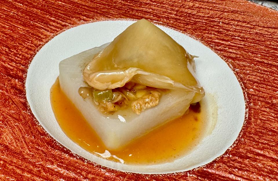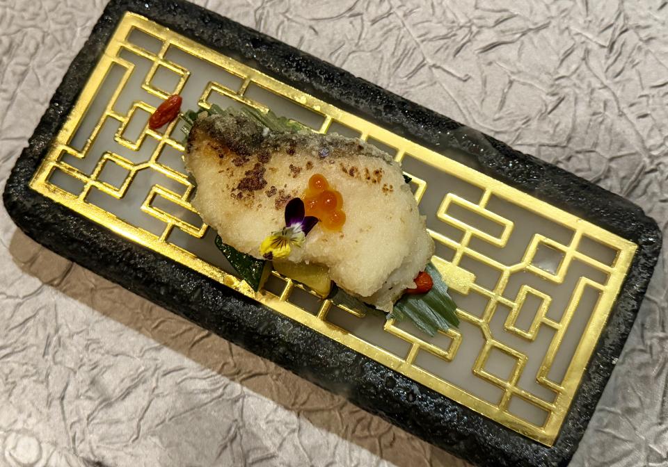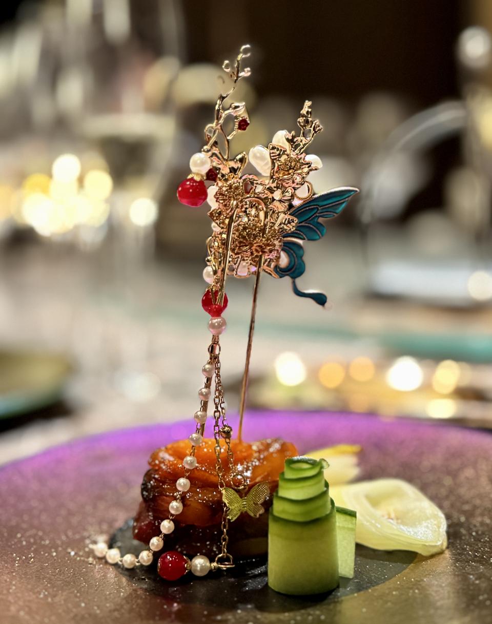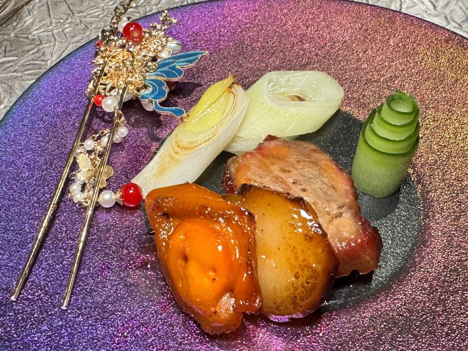 江師傅以元春作為妃子的地位,選用矜貴的鮑魚入饌;先把南非八頭鮑魚以鮑魚汁燜煮至軟腍入味,再以玫瑰露把肥豬肉製成冰肉,之後以叉燒醬醃製脢頭肉;先把鮑魚切半,像三文治一樣包裹著脢頭肉及冰肉,以火燒至脆邊,用玉簪把所有食材串起奉客;叉燒食落瘦而唔柴,配上冰肉爽口唔油膩,高質。