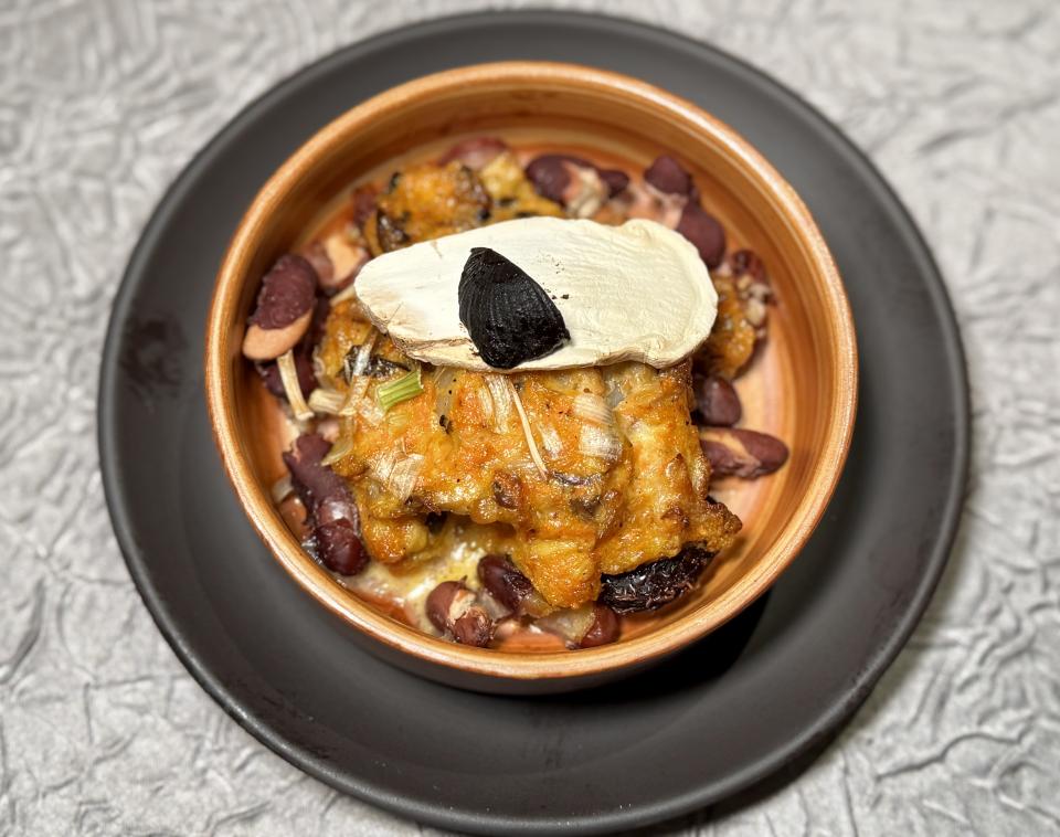 江師傅以李紈專心培養遺腹子及帶子為意念,選擇肉厚鮮甜的帶子入饌,以五色雲豆墊底,表面再覆上蛋黃醬料(松茸、雜菌、甘筍、牛油等製成),放入爐中焗至金黃,最後加上獨子蒜片提味;食落口感豐富,醇厚美味。
