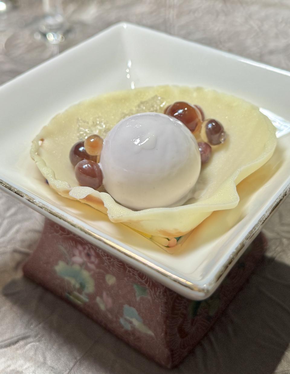 迎春性格懦弱膽怯,一身坎坷,最後更被丈夫虐待至死;大廚有感她猶如「殺蚌取珠」的人生,故以珍珠為靈感,創作這道甜品;以紫薯及紅豆為材料,製成出香甜細滑的慕斯,以白朱古力製作成貝殼造型,加入切粒白酒啫喱及紅豆爆珠,食落甜而不膩,輕咬爆珠更會在口腔內爆開,紅豆甘香微甜,口感有趣。