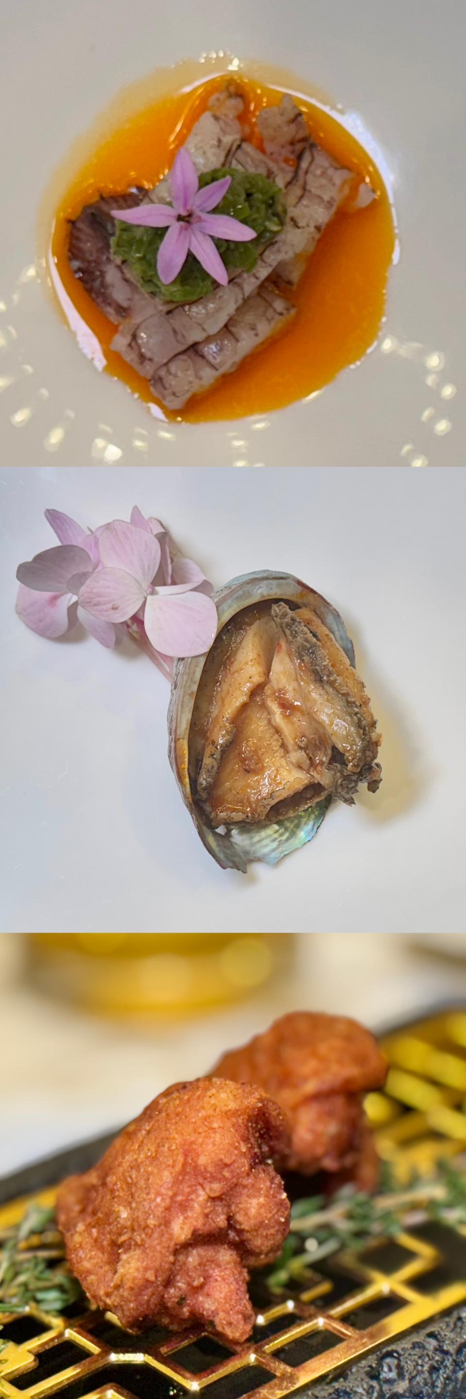 首先上場的三味前菜,分別係「紅油椒醬輕煎富貴蝦」、「辣清酒煮昆布鮑魚」及「女兒紅南乳無骨脆皮雞」。