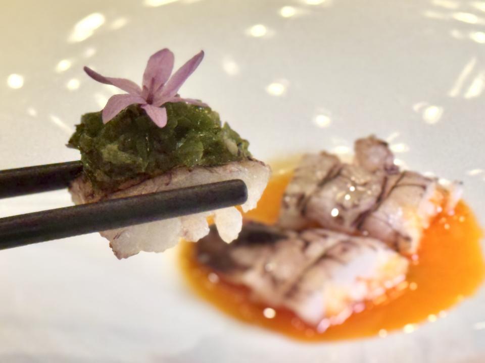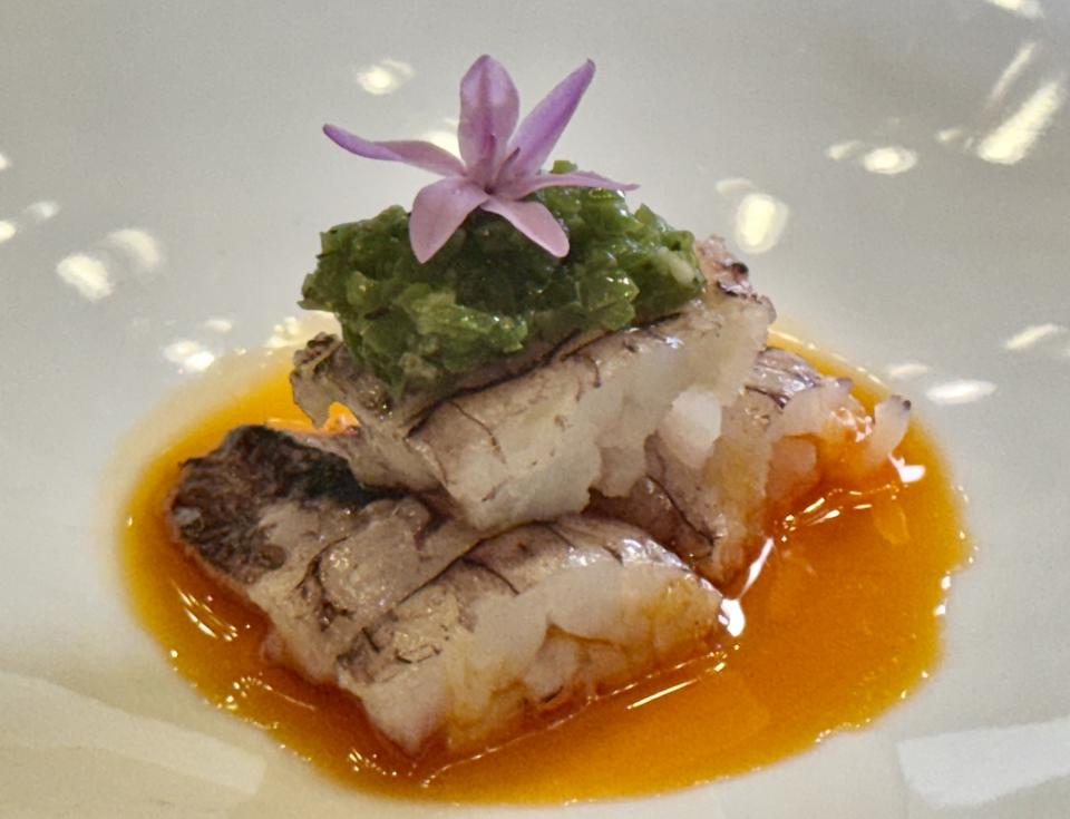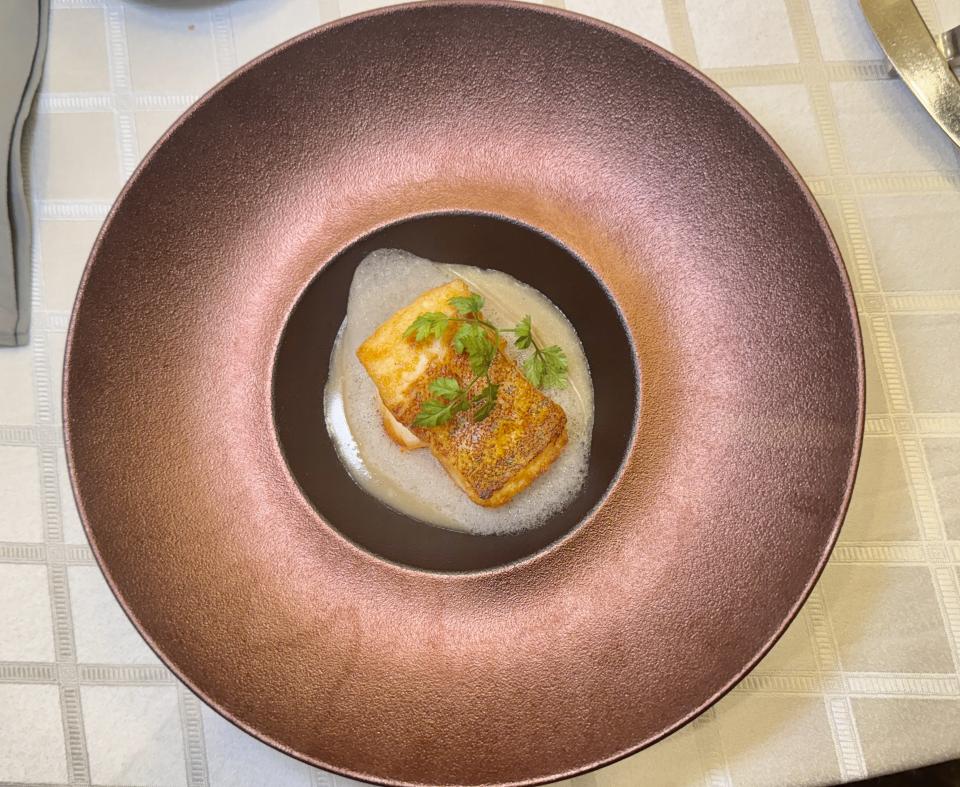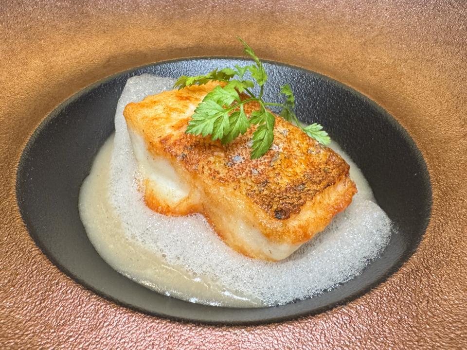 「逸‧藝」羅望子汁香茅泡沫煎星斑柳,師傅以羅望子及香茅打成口感綿滑的泡沫,中間放有煎至皮香肉嫩的星斑柳,很有東南亞風味的一道菜式。