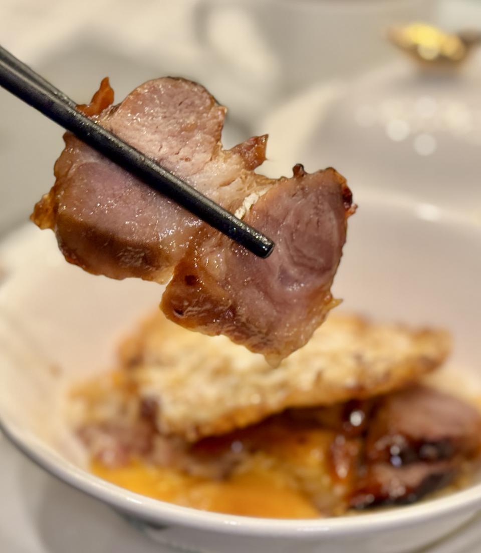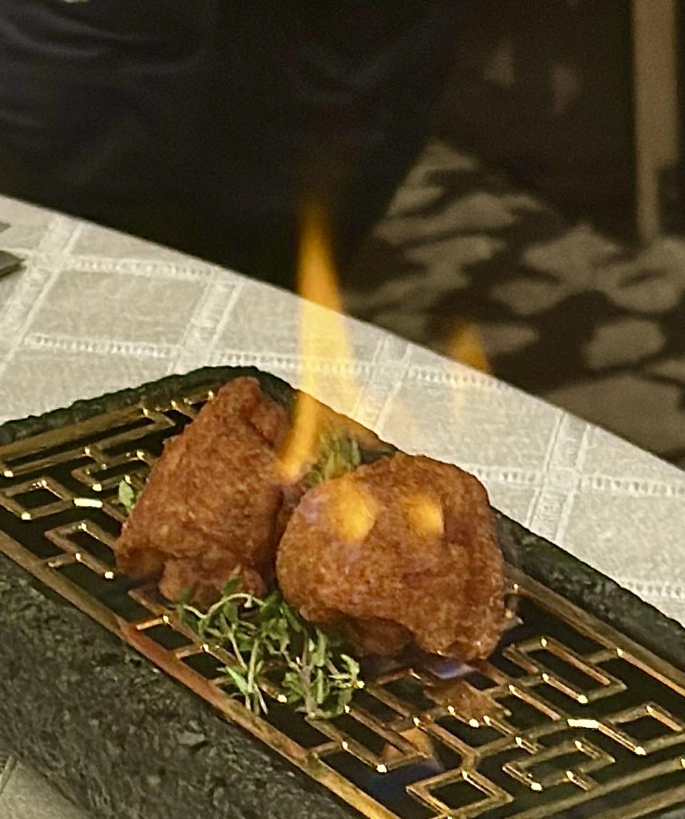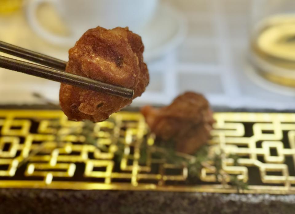服務員先放下無骨脆皮雞,之後點燃手中已放入酒精的鐵盆及傾倒在雞皮之上,火焰把雞皮燒得更加香脆及傳出陣陣幽香,大家這刻當然也忙於打咭;因雞肉事前已去骨,食落更加方便,肉質鮮嫩加上外皮酥脆及陣陣南乳香味,好吃。