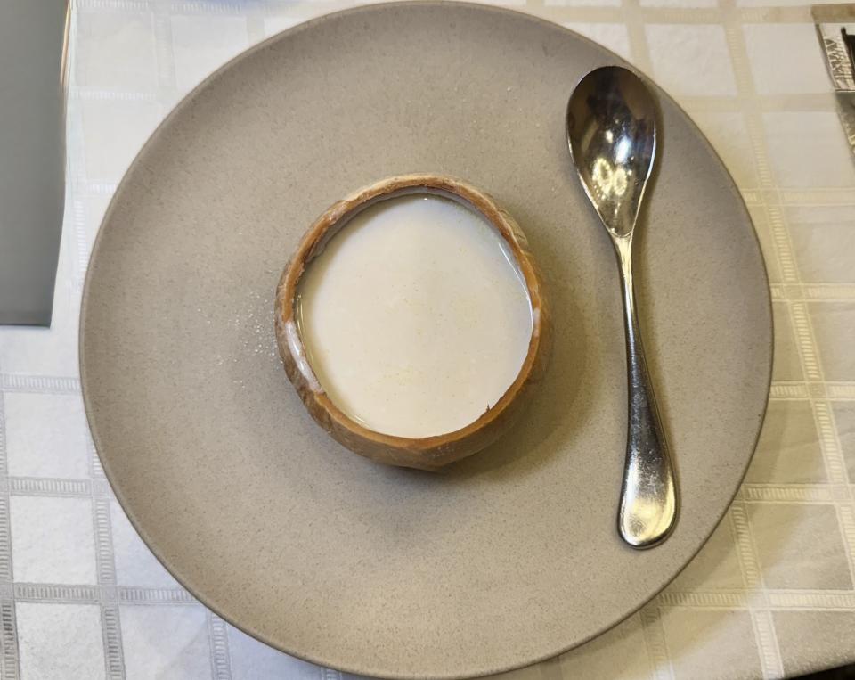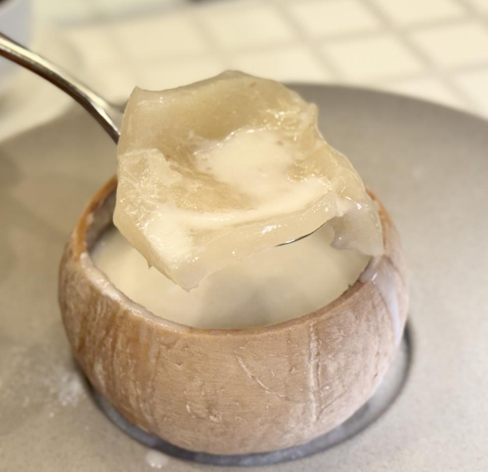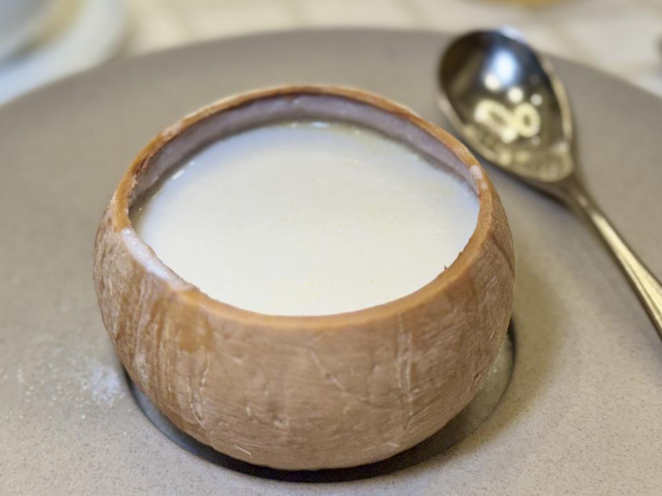 超美味的「逸.湯」原個椰皇濃湯燉厚花膠,新鮮熱辣,湯水香甜又滋潤,中間放有一片超厚的花膠,口感Q彈又爽脆;最後把嫩滑的椰皇肉整片刮出,口感如牛奶布丁般彈滑,滋味又飽肚。
