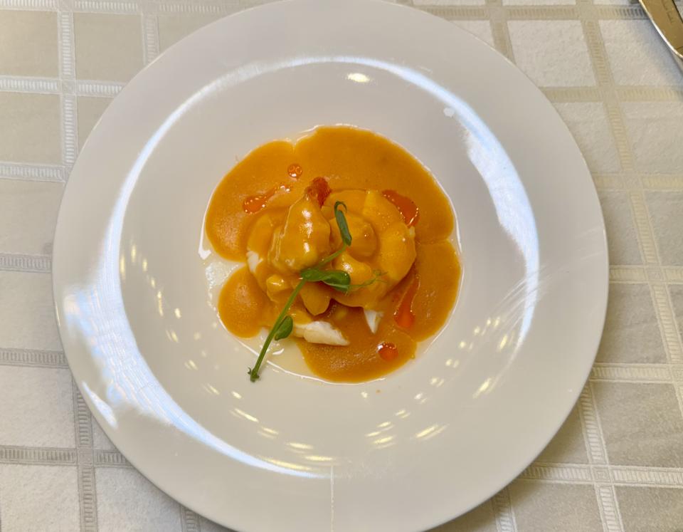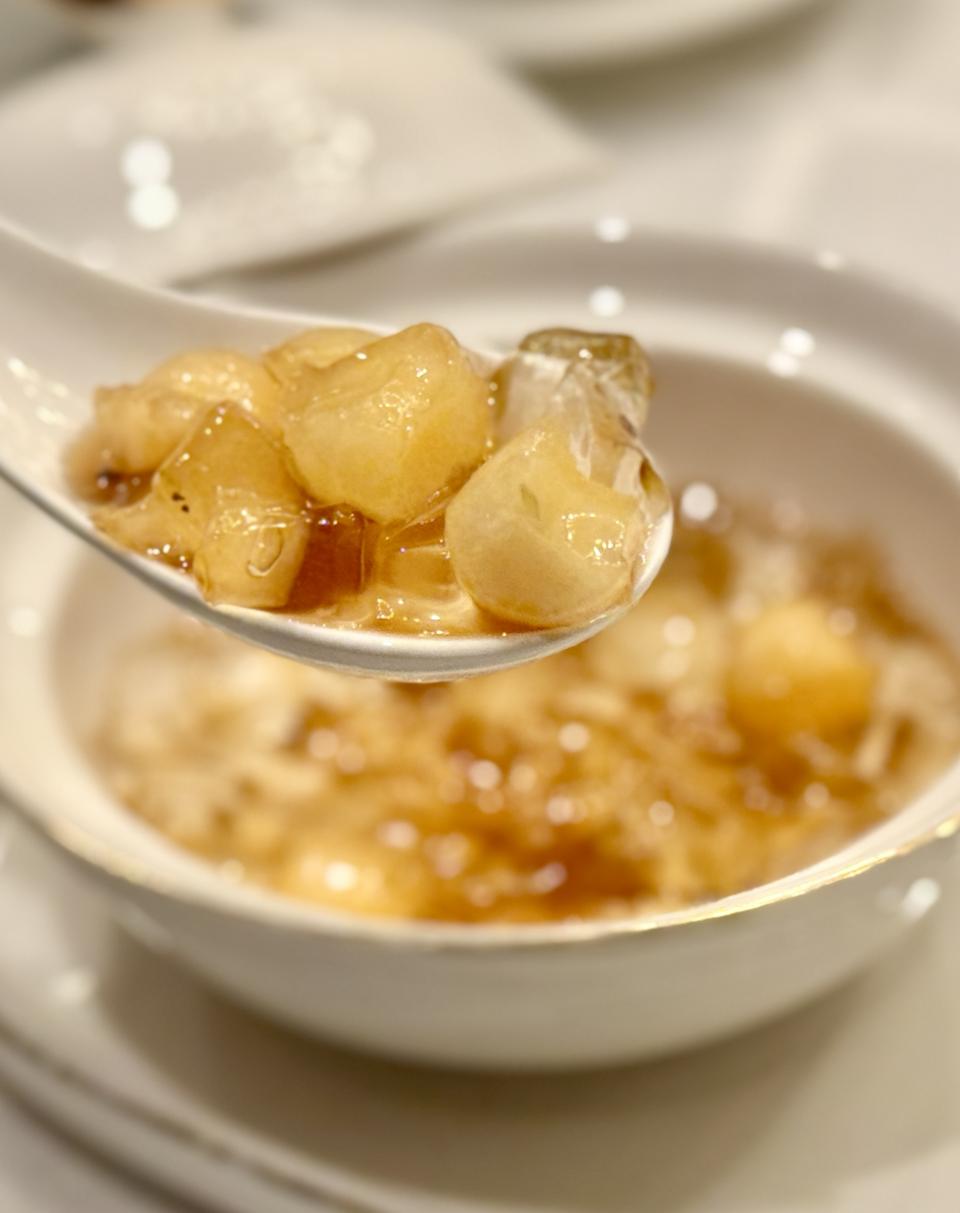海鮮湯本灣龍蝦白玉,大大隻的本灣龍蝦放在碟子中間,肉質飽滿、口感爽彈,表面淋上一層濃濃而杰身的海鮮湯,碟底還有香滑的蒸蛋白及軟糯的麻糬,鮮甜爽彈香滑共冶一爐,又怎會不叫人喜歡,好吃。