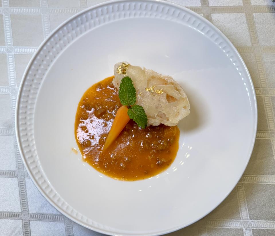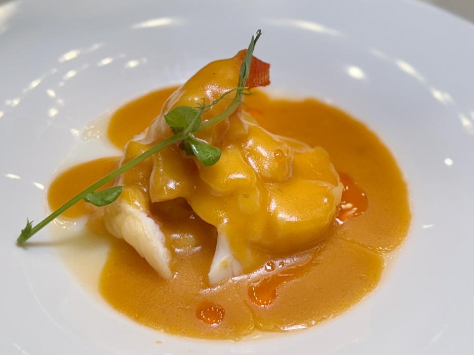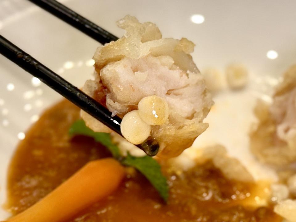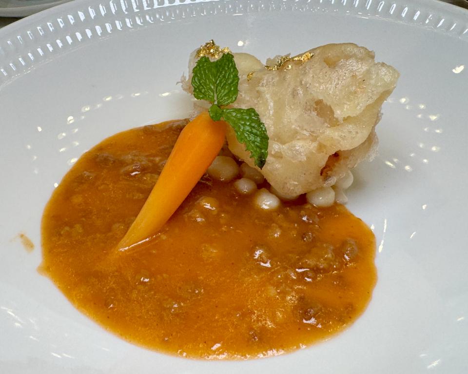 乾燒百花脆皮花膠伴溫室小甘荀,以花膠包裹着鮮甜爽彈嘅蝦膠,加上粉漿炸至表面香脆,形成外脆來Q彈的口感;旁邊放有色澤鮮艷,口感清甜的小紅蘿蔔;淋上像如香茄子的醬汁,惹味又開胃;碟邊放有煙靭有咬厚的雞頭米伴碟。