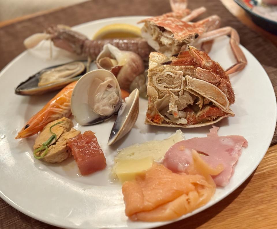 冰鎮海鮮是最易回本的,也是大衆最期望的,今晚有花蟹、沙白、海蝦、半殼青口、麵包蟹、海螺及瀨尿蝦,原來每樣拿少少已一大碟了。
