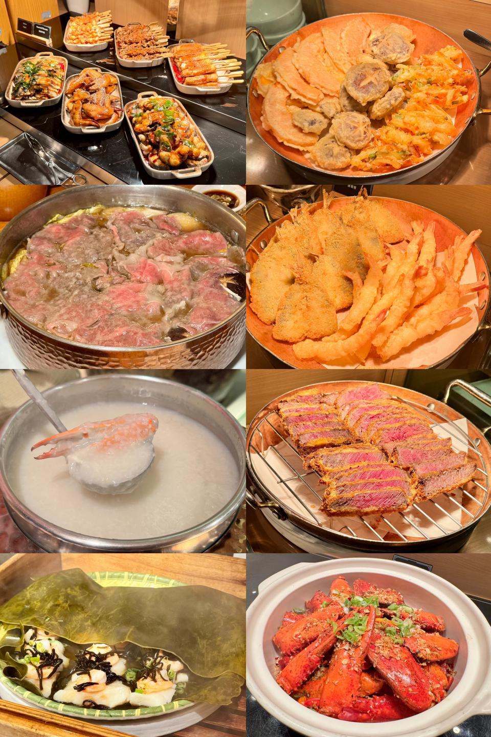 日式美食自然也是今次的重點內容,這吉列和牛,粉嫩的色澤,單看表面已非常誘人;天婦羅、蟹粥、海帶蒸海鮮及和牛壽喜燒,每一樣也非常吸引。