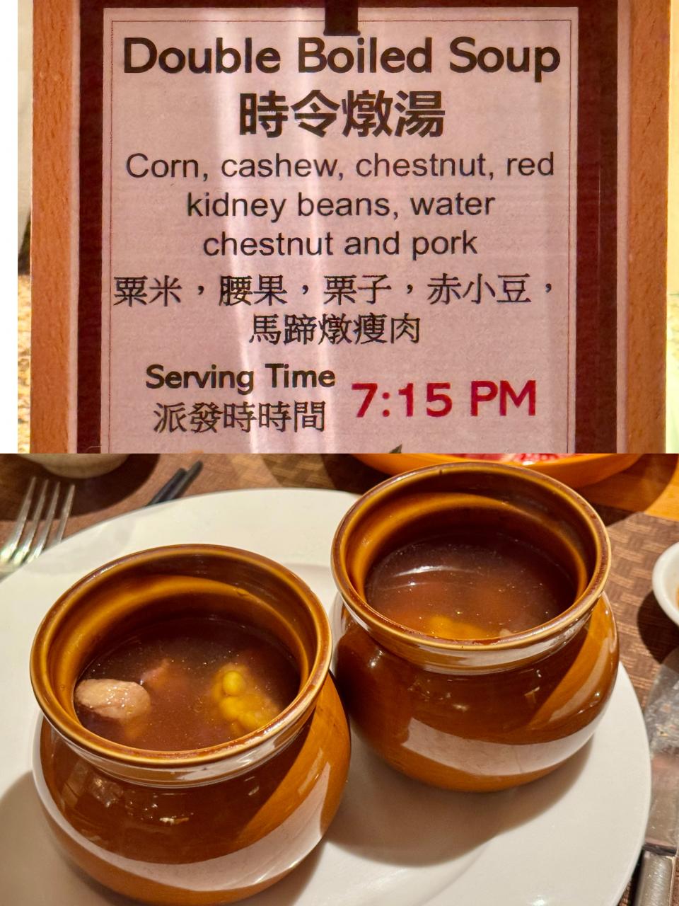 每晚7:15pm也會響起音樂,也是告訴你,這盅「粟米腰果栗子赤小豆馬蹄燉瘦肉湯」出爐的時間,新鮮熱辣,香甜又滋潤。