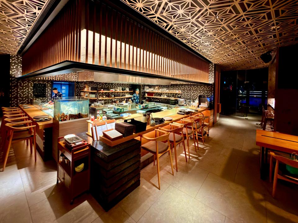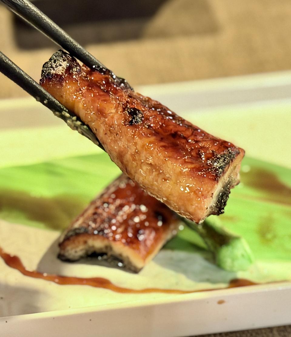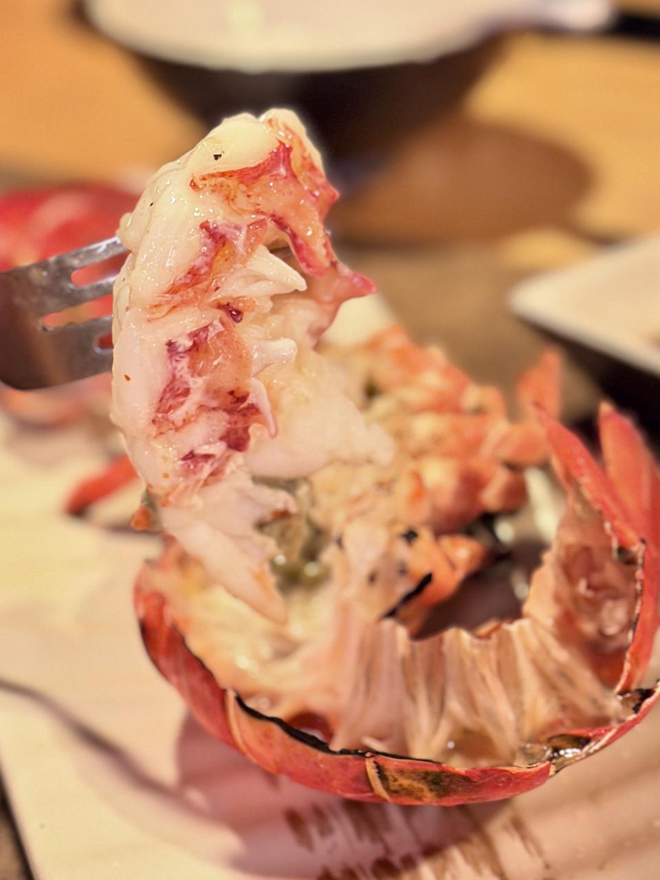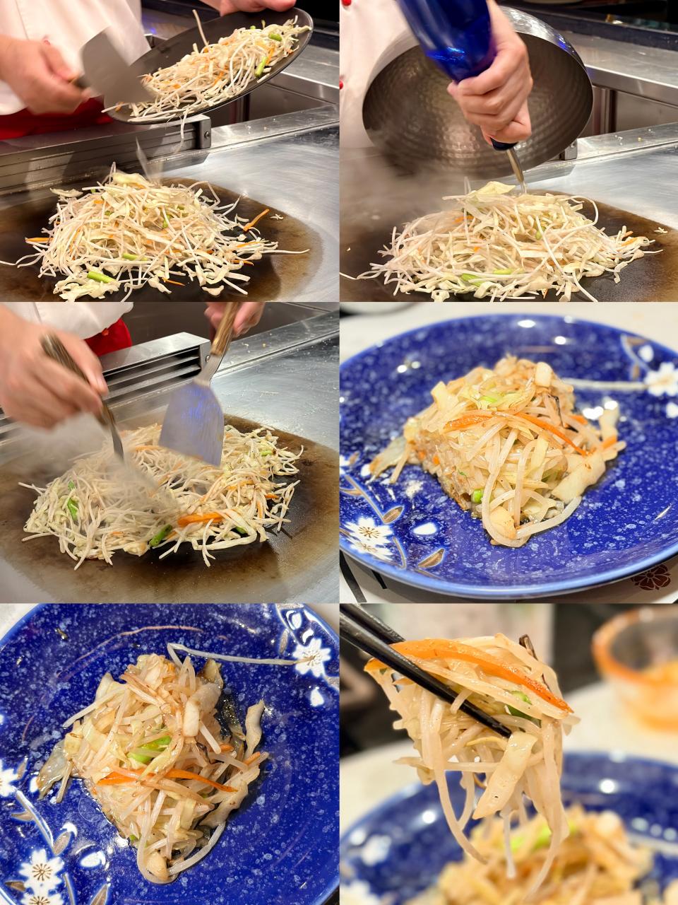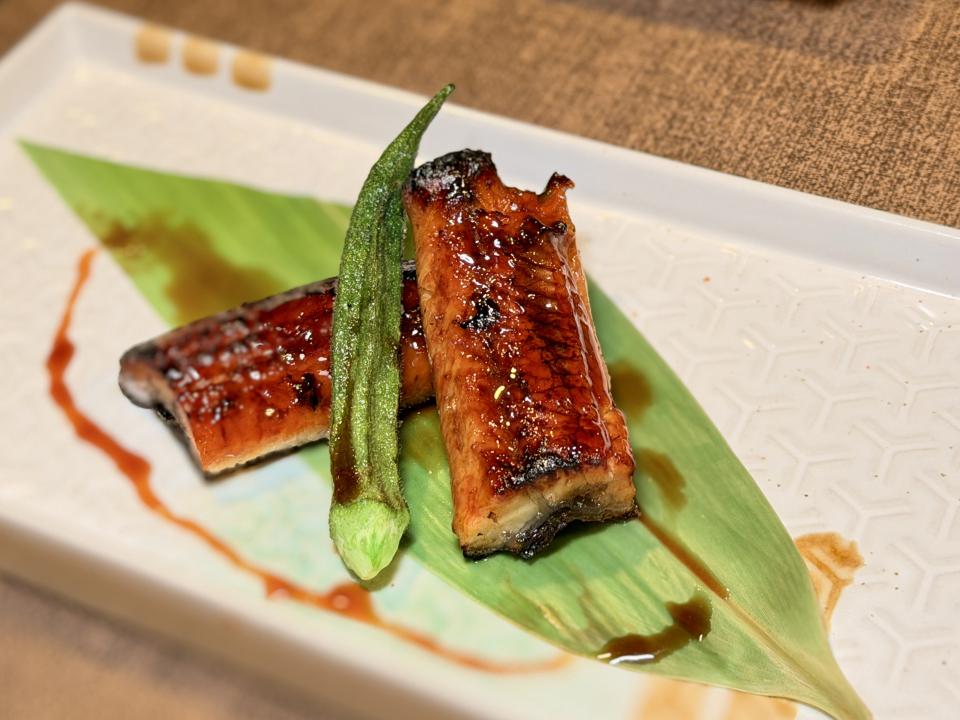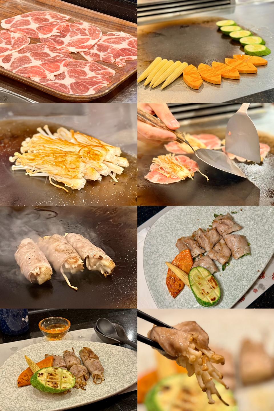 不吃牛的我,特意把和牛換成了「金菇豚肉卷」,大廚先把金菇放上鐵板,燒至恰到好處的熟度,再鋪上薄切豚肉片,煎到邊緣微微焦脆。隨後以巧手將豚肉緊緊包裹着金菇,繼續煎香。豚肉在高溫下油光閃亮,油脂香氣不斷滲出,與金菇的清新草本氣息交織,入口既濃郁又清爽,層次分明,令人一試難忘。