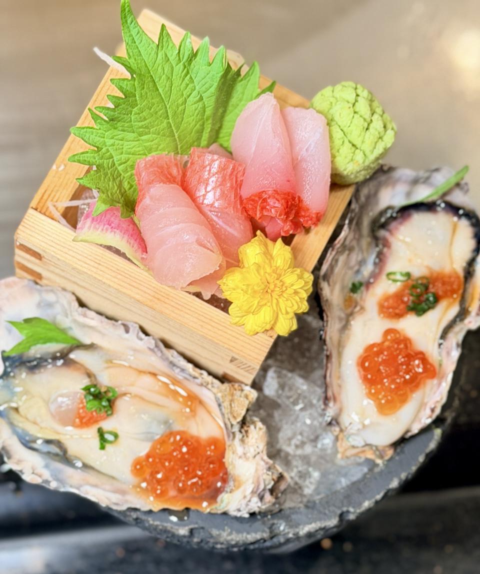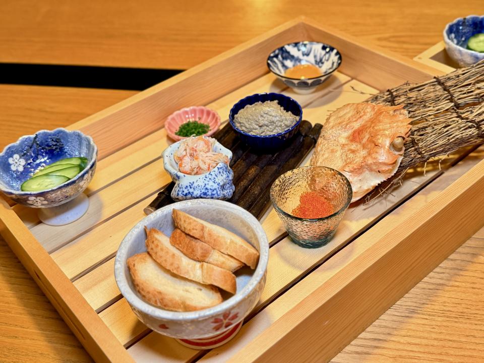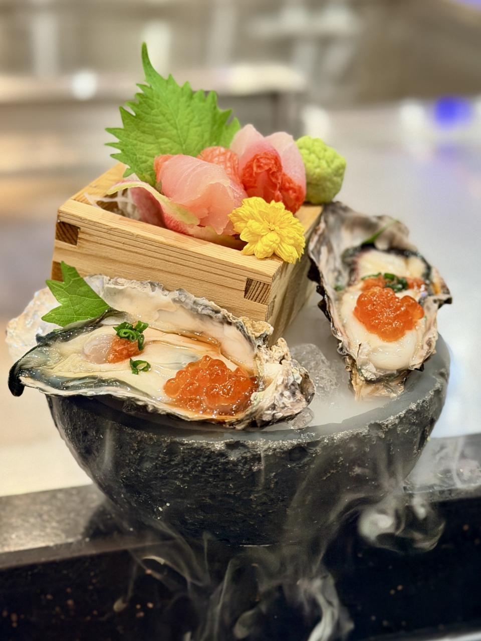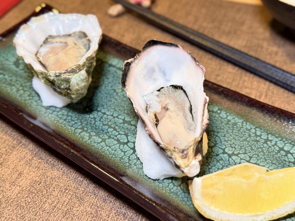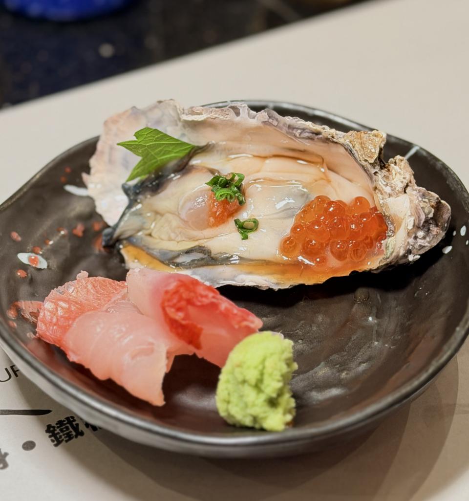 接著上場的是「金目鯛刺身及日本室津生蠔」,金目鯛刺身是細膩鮮甜的代表,室津生蠔則是濃郁鮮美的極致。兩者同場,形成「清爽 × 醇厚」的對比,既能享受魚肉的優雅,又能體驗生蠔的豪邁,正。