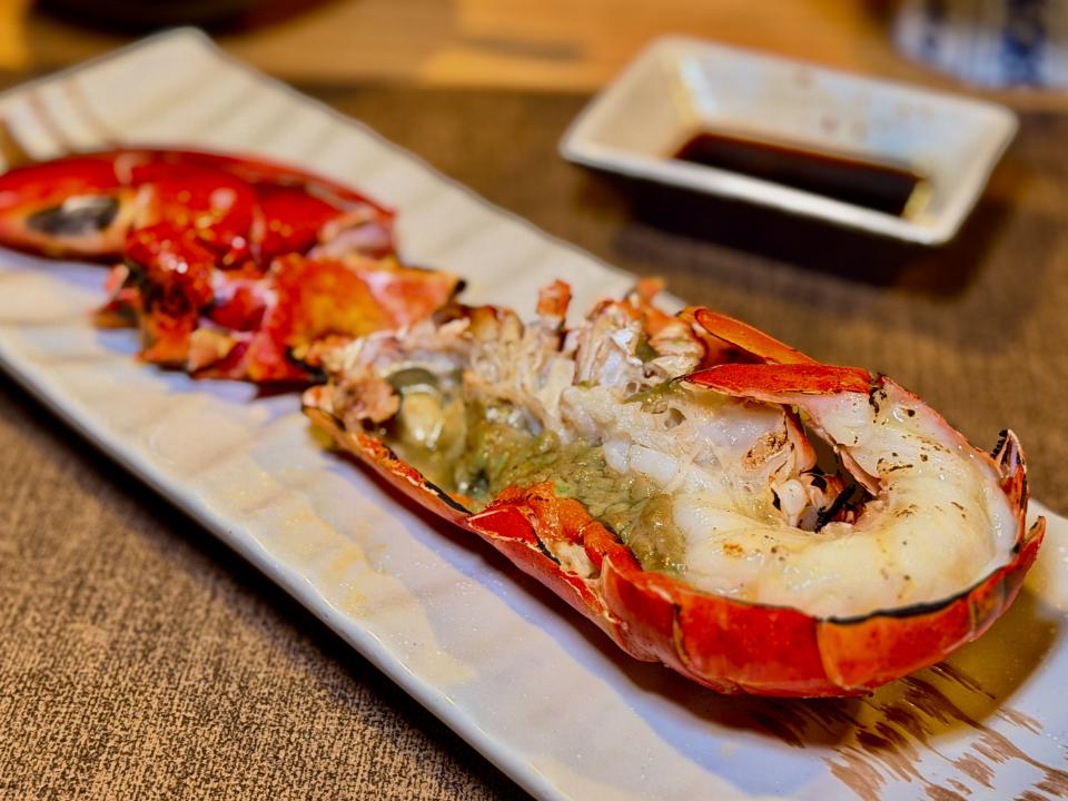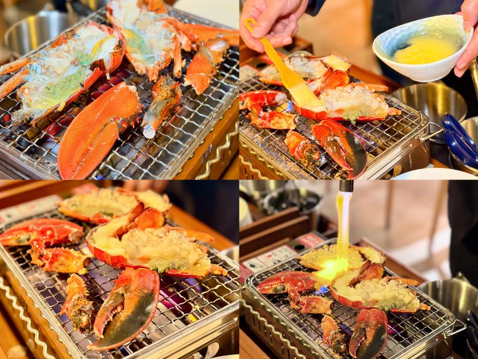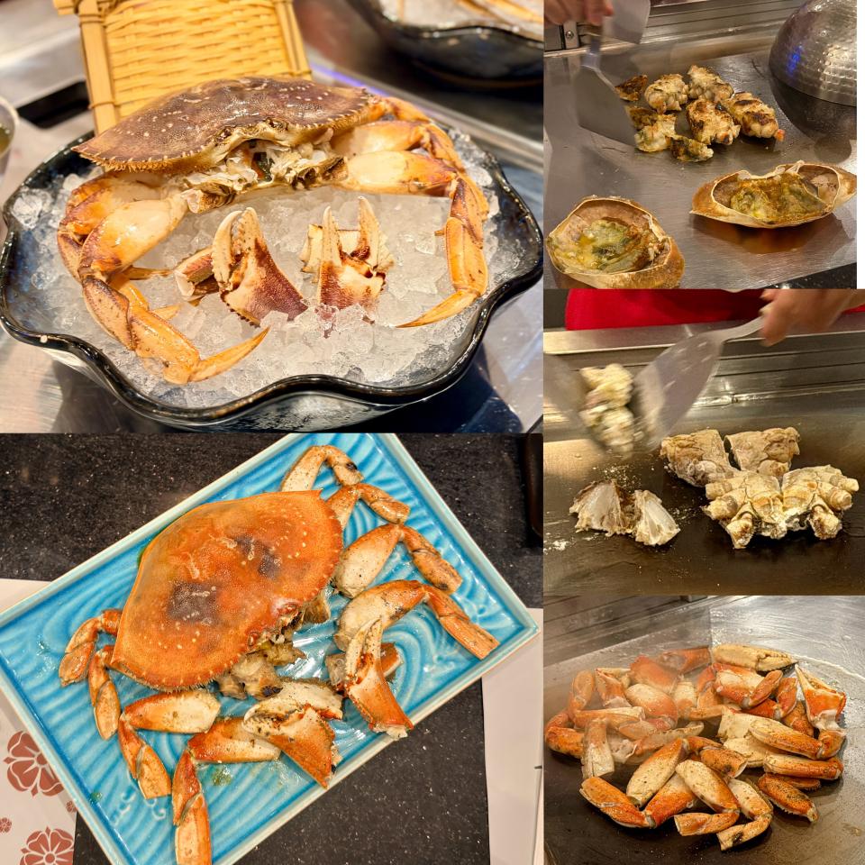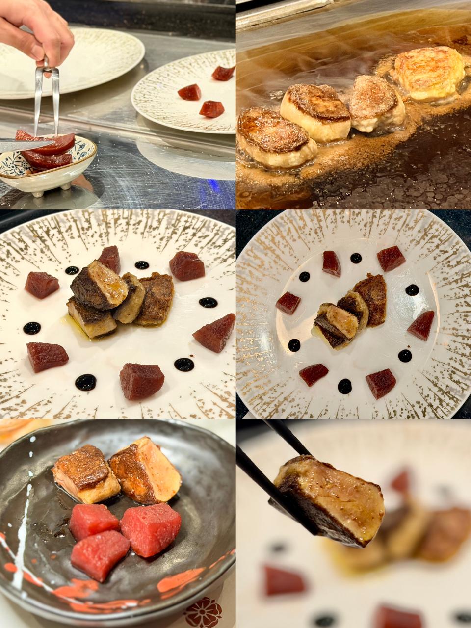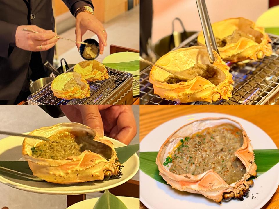 「鐵板燒時令原隻蟹」看著大廚飛快的手指,拿著工具把蟹件在鐵板上舞動,宛如舞蹈般華麗;最利害是大廚把燒好的蟹件重新拼砌成完整的大蟹,帶來強烈的舞台感,非常厲害;蟹件在鐵板燒的高溫下更能鎖住汁液,令肉質更加香濃;食落鮮甜帶有一點海水清爽的鹹香,也能保持嫩滑,清鮮與蟹膏的濃郁形成鮮明的對比,令人回味。