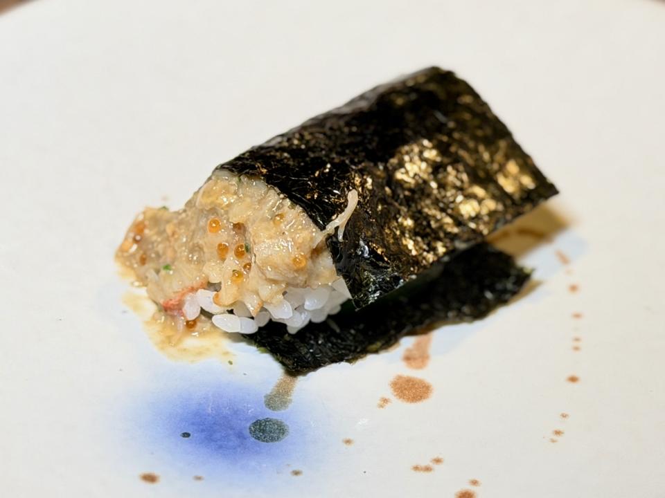 蟹肉絲絲分明,鮮甜清爽,入口柔滑;三文魚籽晶瑩剔透,咬下去瞬間爆汁,鹹香油脂在口腔中迸發~一清一濃,層次感滿滿,蟹肉的細緻優雅配上魚籽的豪邁濃烈,口中像開了一場奢華派對。視覺上更是滿分:紅橙色魚籽點綴在雪白蟹肉上,閃閃發亮,像一碗小小的海洋珠寶。