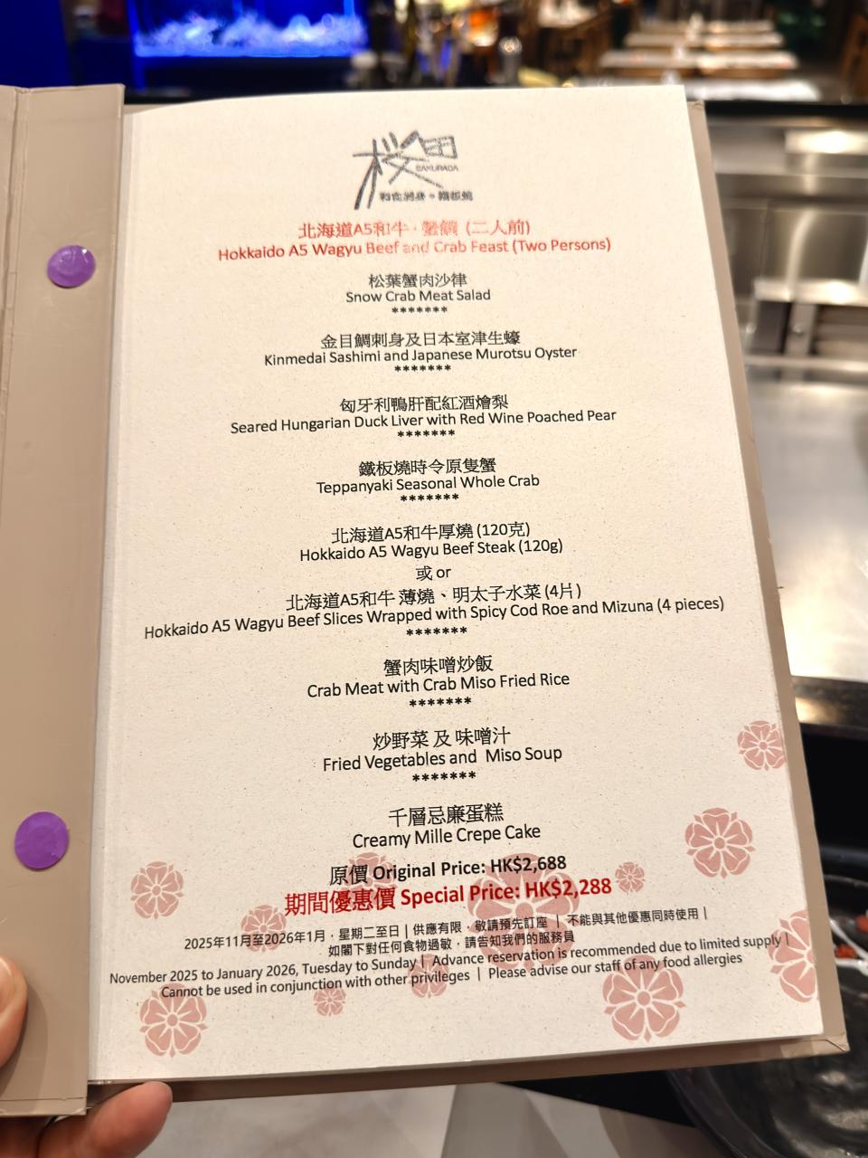 原價 : $2,688,現在優惠價 : $2,288,供應期由2025年11月至2026年1月,逢星期二至日,供應期有限,最好預留訂座。