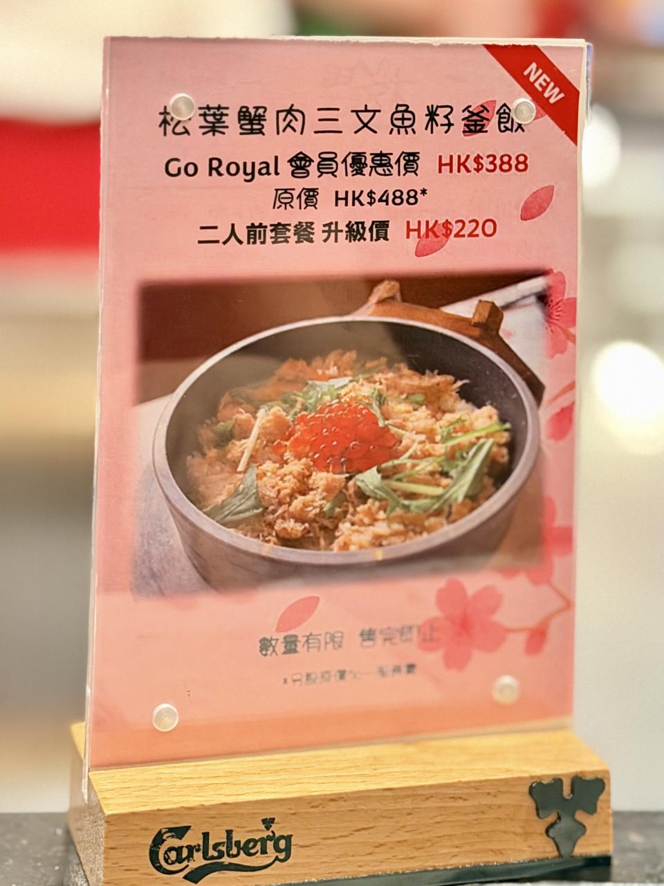 原價 $488的釜飯,現在只需加$220,便可把套餐中的蟹肉味噌炒飯,升級為「松葉蟹肉三文魚籽釜飯」,超值抵食。