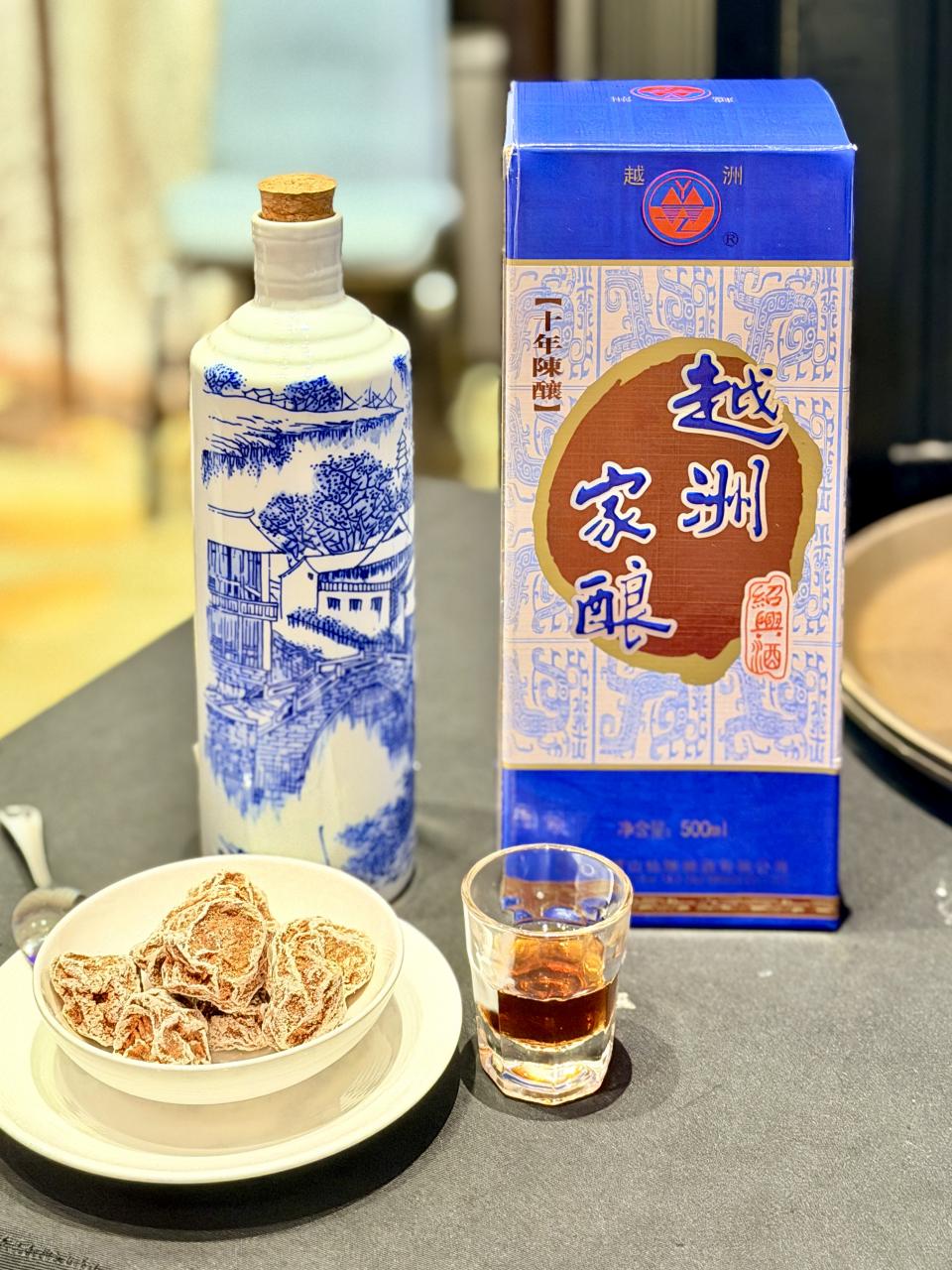 食大閘蟹怎少得紹興酒?這支「越洲家釀十年」以糯米、小麥、曲和鑑湖水手工釀製,屬黃酒,酒體醇厚香濃,經十年陳釀更顯甘醇,富含胺基酸與維生素,是紹興酒中的上品。