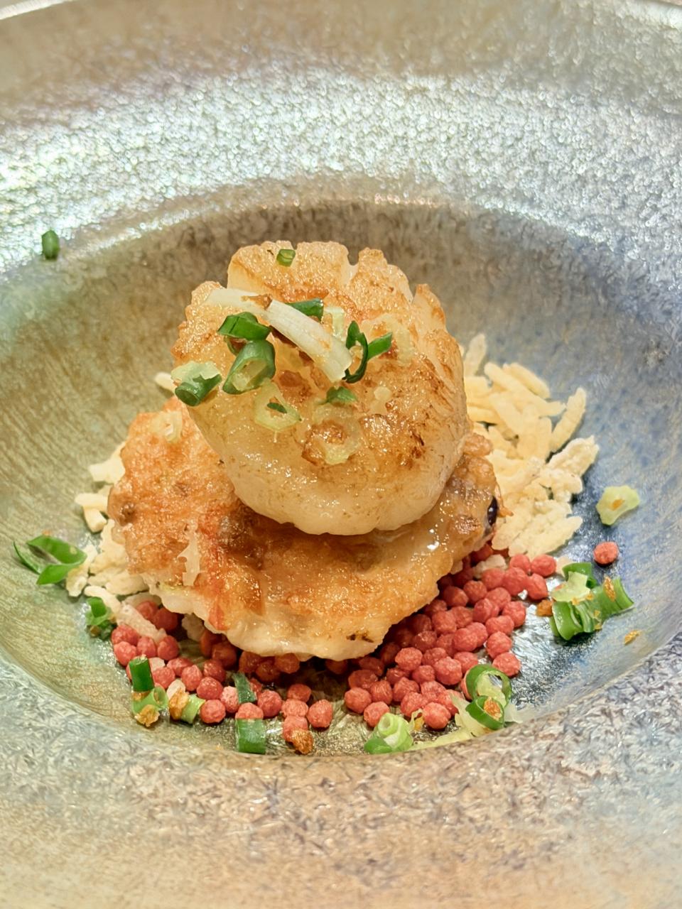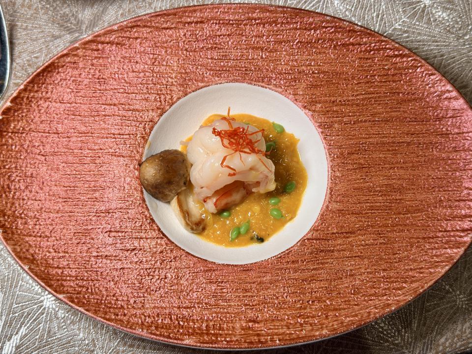 好有創意的「龍蝦湯蟹餅五穀苗」!自家米餅係用萵筍粒、炸米同蟹肉整成,香脆又有口感~再配埋鮮嫩帶子、紅果子,加埋蝦米辣椒醬煮嘅龍蝦湯,湯底鮮甜又溫潤,仲帶少少鹹香微辣,好惹味!整體味道好協調,層次分明,食落去又鮮又香,真係食完會諗住再食!