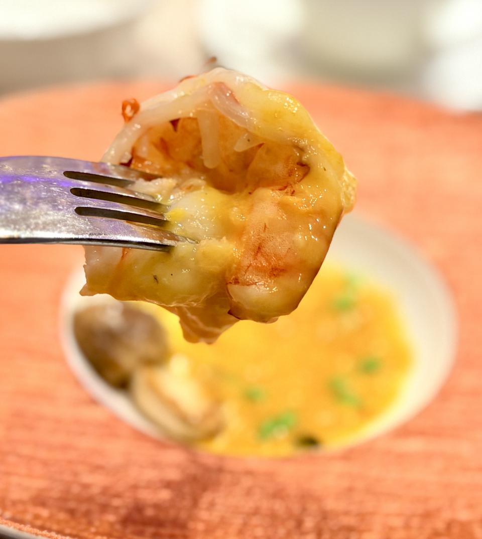 呢道「鮮姬松茸蟹皇虎蝦球」真係好有心思!先將虎蝦球汆燙,去油之餘又鎖住水分,食落彈牙又唔油膩。再加上蟹粉同秘製調味料,鮮味即刻升級,香到不得了;旁邊仲有煎到香氣四溢嘅姬松茸,菌香同海味互相襯托,層次感超讚!