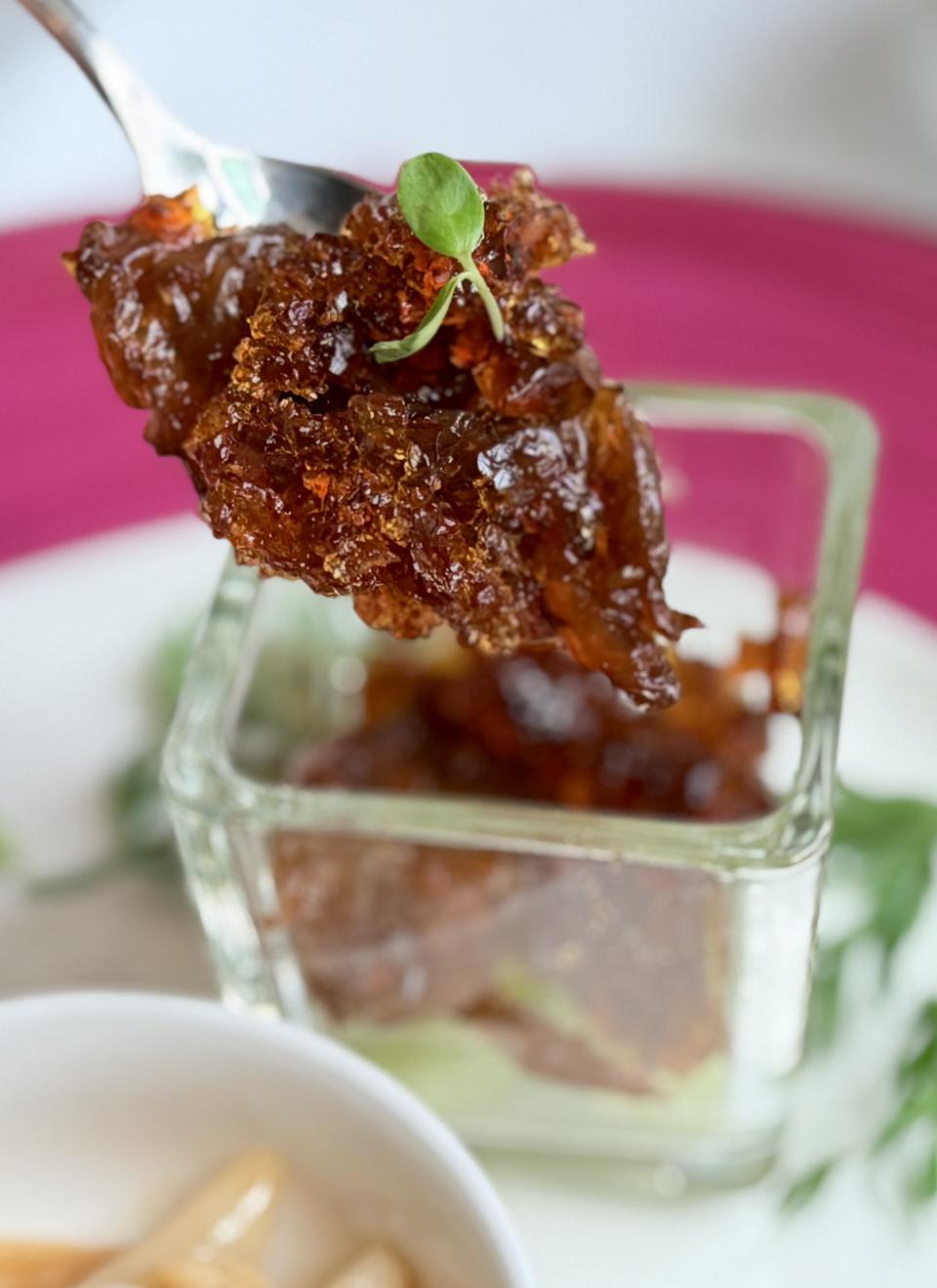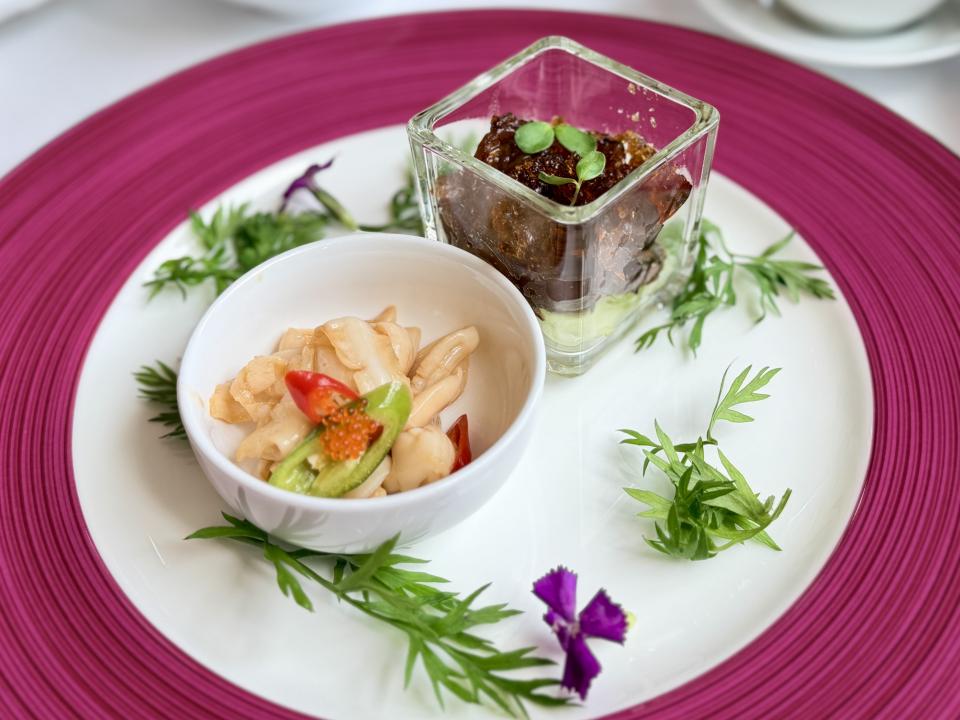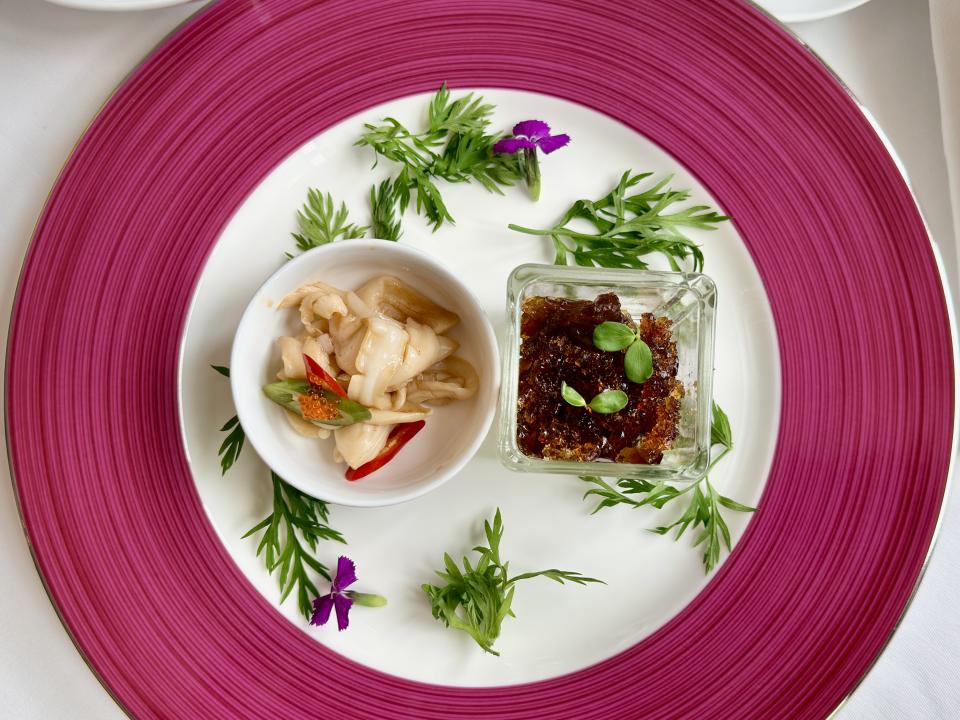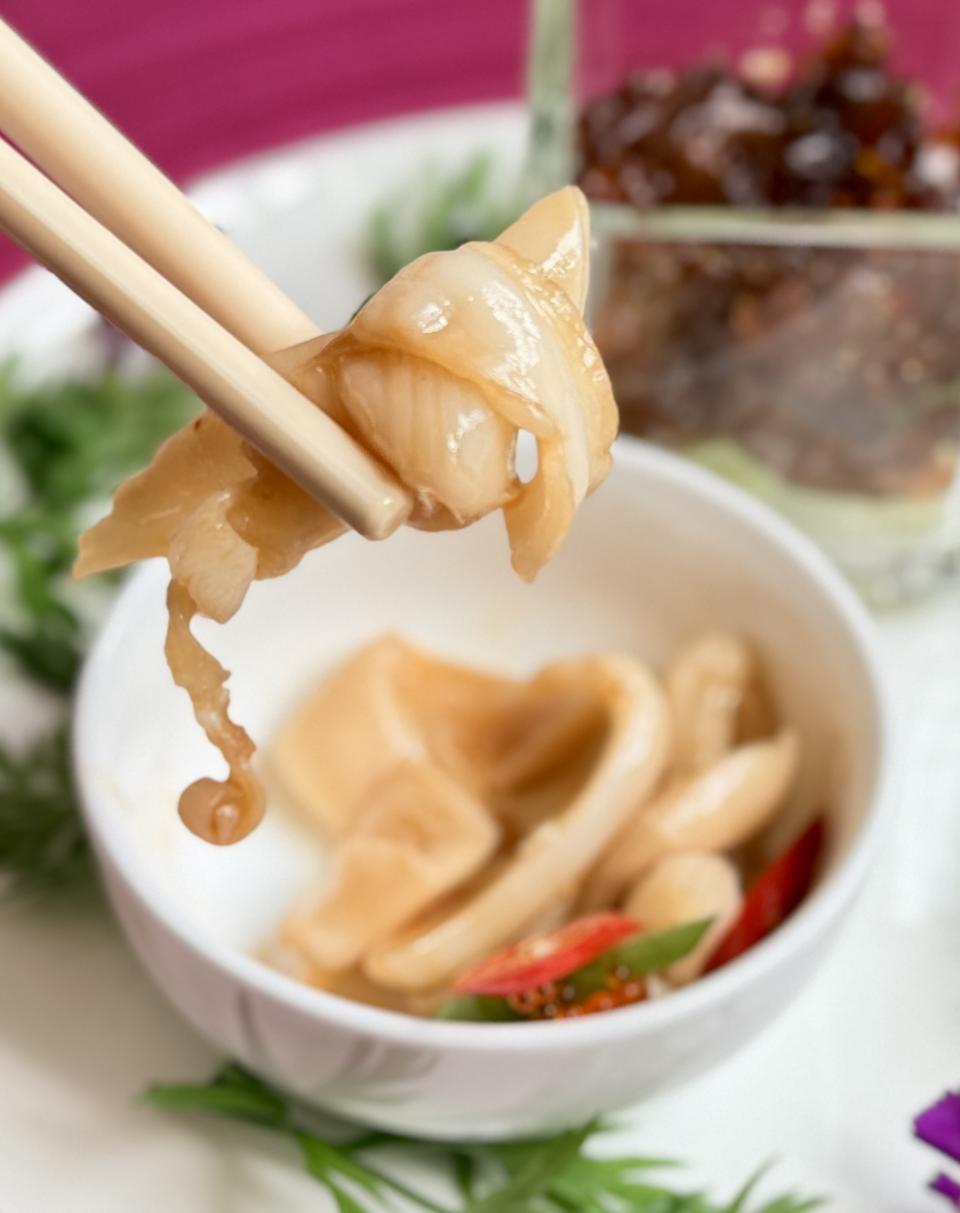 舟山蜇頭肉厚爽脆,加入陳醋的啫喱食落清涼有冰凍感,晶瑩剔透的啫喱夾雜帶鹹香的蜇頭,入口如「冰涼的海水」。蟶子肉質肥美爽滑,經過麻辣撈汁浸潤後,色澤油亮,香氣撲鼻,令人食慾大開。