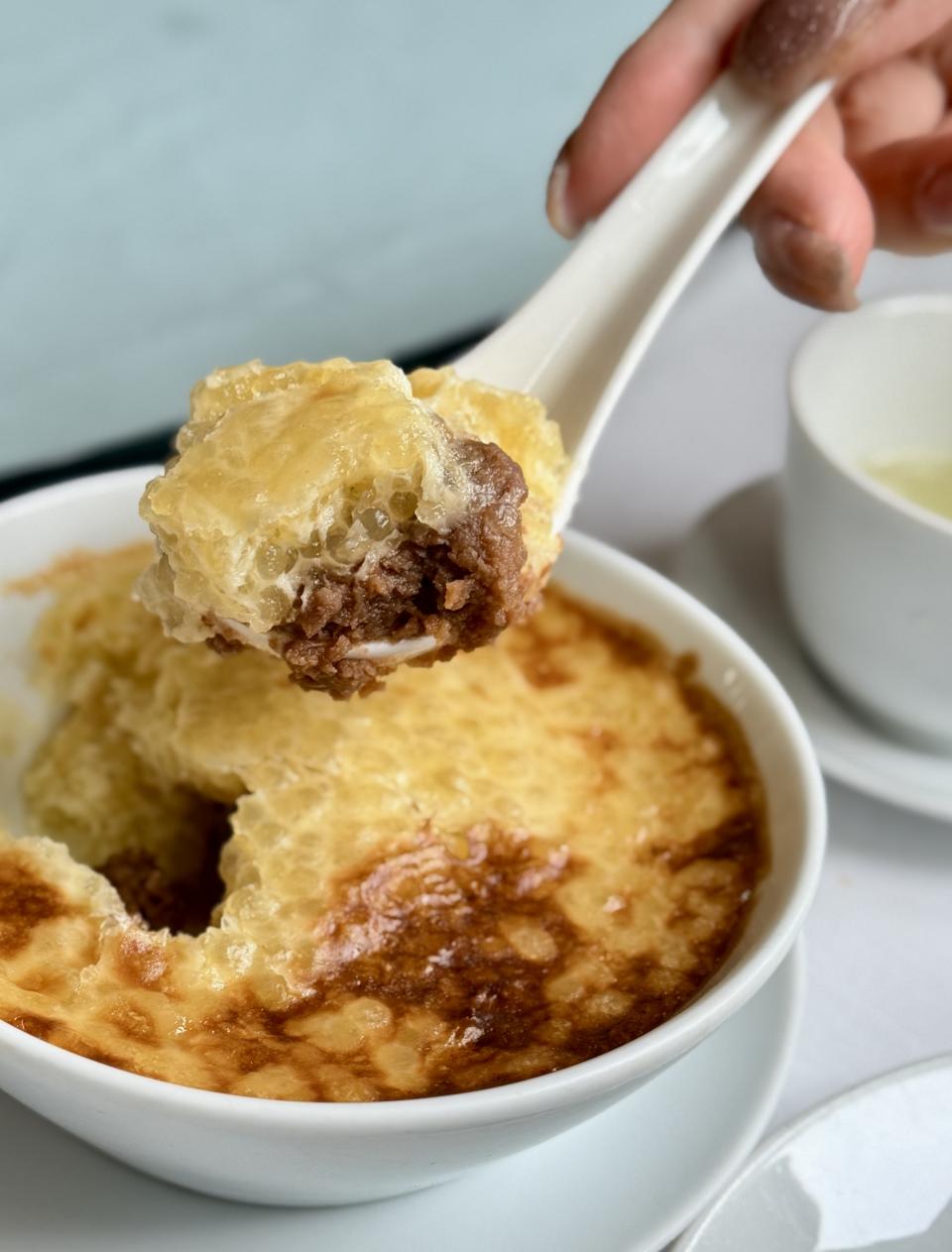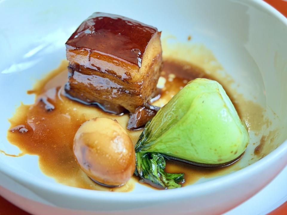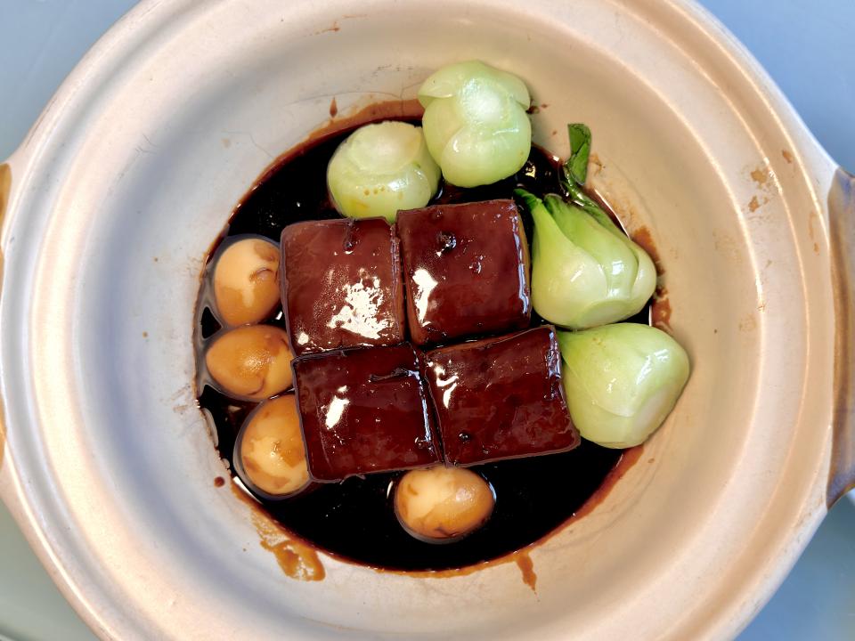 肥肉軟爛、入口即化、肥而不膩,口感如布丁般滑溜,瘦肉則保留適當肉汁,食落不柴;旁邊放有鮮甜翠綠的青菜及滑嫩Q彈的鵪鶉蛋;整體香甜鹹鮮,帶有濃郁的酒香和醬油味,是非常出色又令人回味的菜式。