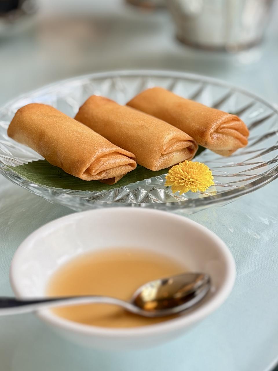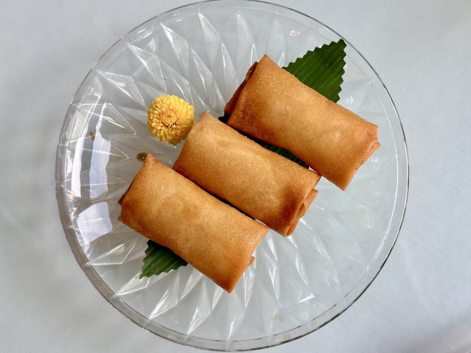 春卷外層炸至金黃酥脆、餡料則軟糯清甜,食落口感清爽,不油膩;旁邊以黃菊花襯托,看似一幅畫般美麗。