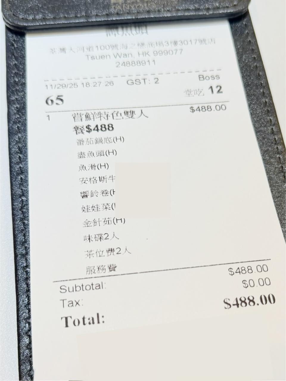 二人套餐 $488,包晒湯底、魚頭、魚滑、牛肉(改豚肉)、響鈴卷、娃娃菜、金針菇同甜品,抵食到爆 💥。